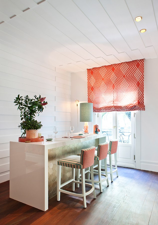 Un espacio ecléctico, con una zona de bar-cocina al estilo MidCentury con una lámpara tutú que además de aportarle un toque divertido, le da frescura al espacio conjugado con el resto de formas y materiales.