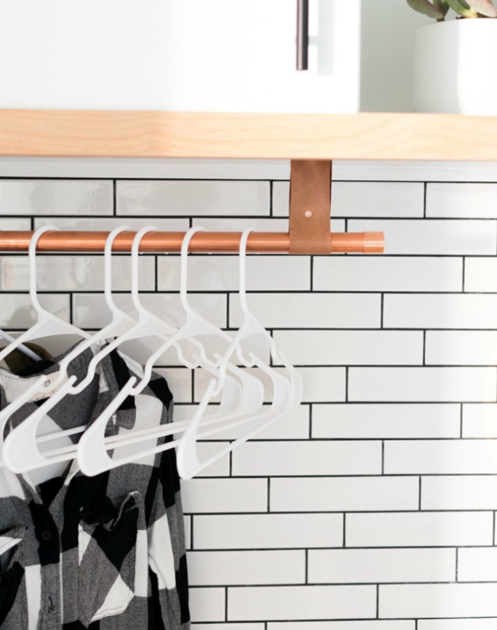 Para colgar las camisas, vestidos y chaquetas se ha creado un practico perchero con dos tiras de cuero y una barra de cobre sujetas en la zona baja de los muebles altos.