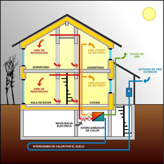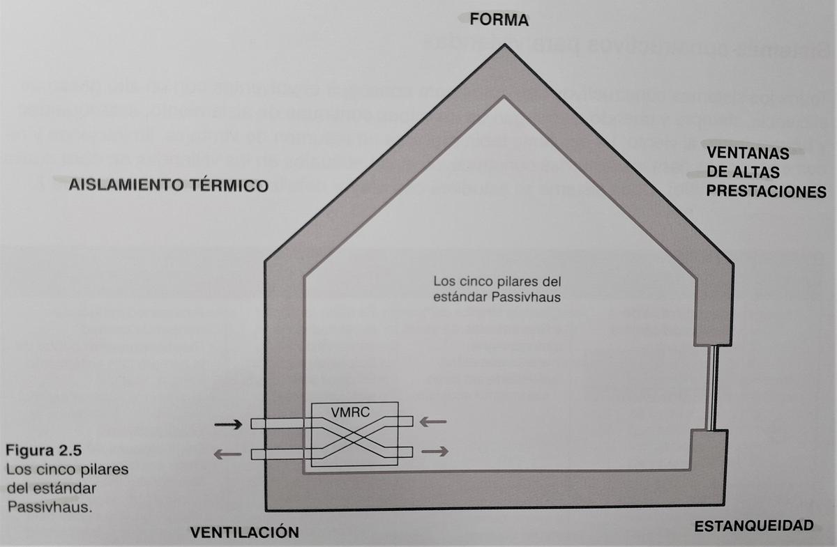 Ventilación: el estándar Passivhaus es un buen ejemplo de la estrategia construye herméticamente y ventila correctamente y se basa en la combinación de una envolvente estanca y la ventilación mecánica con recuperación de calor, que permite una renovación continua de aire con una admisión y extracción equilibradas.