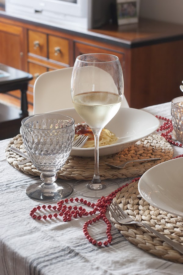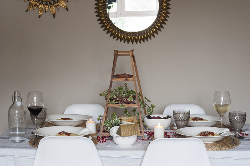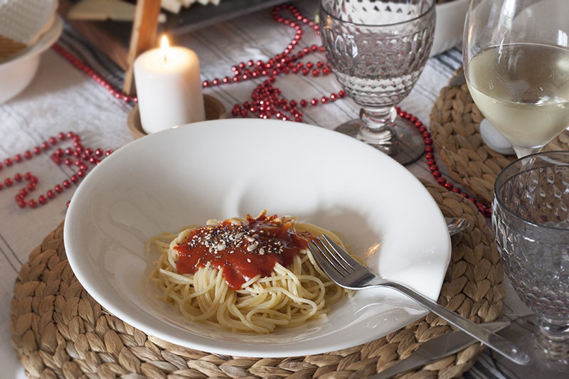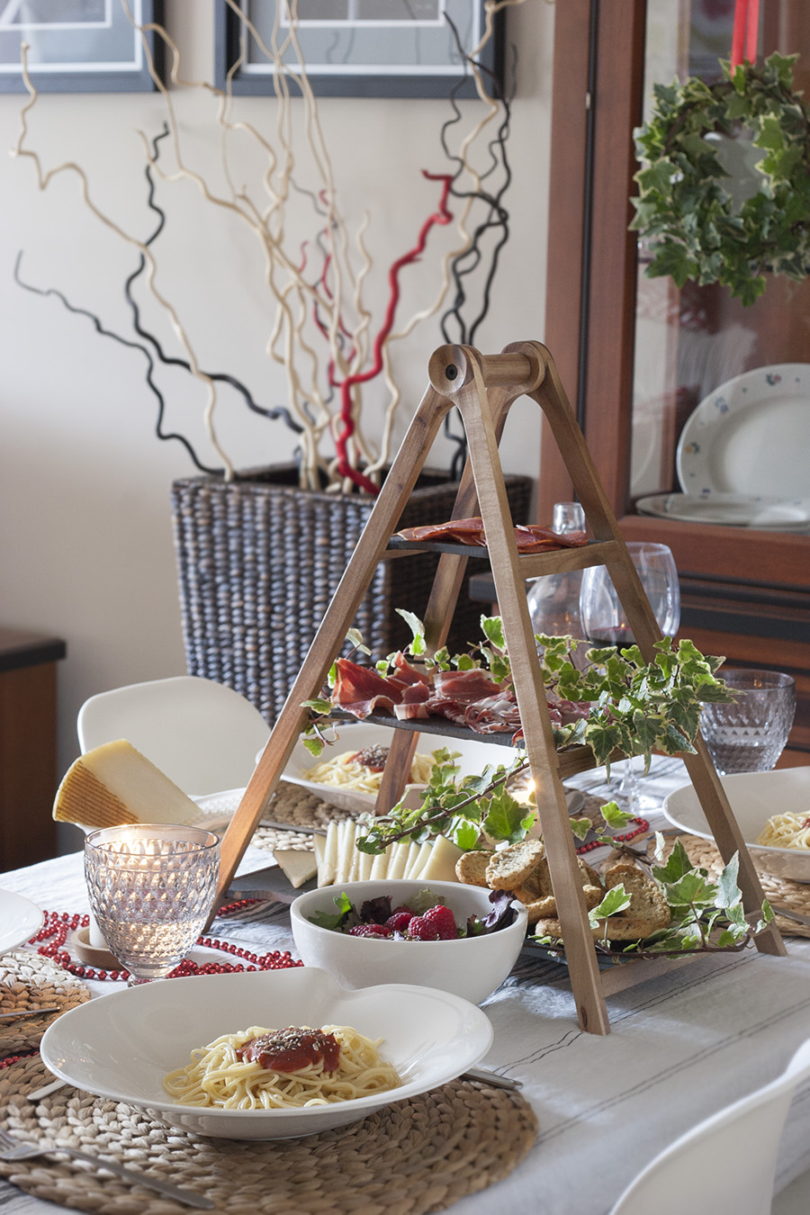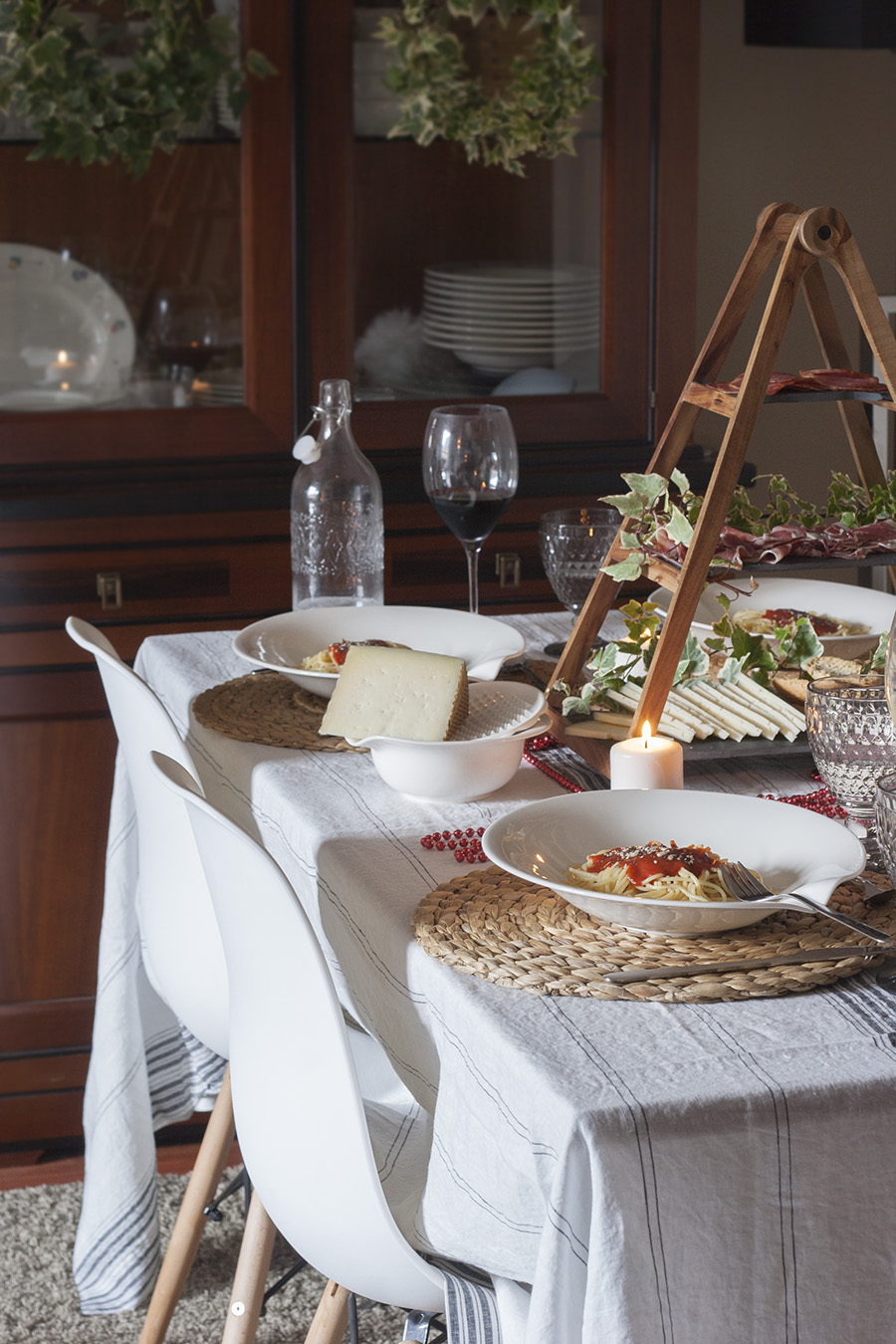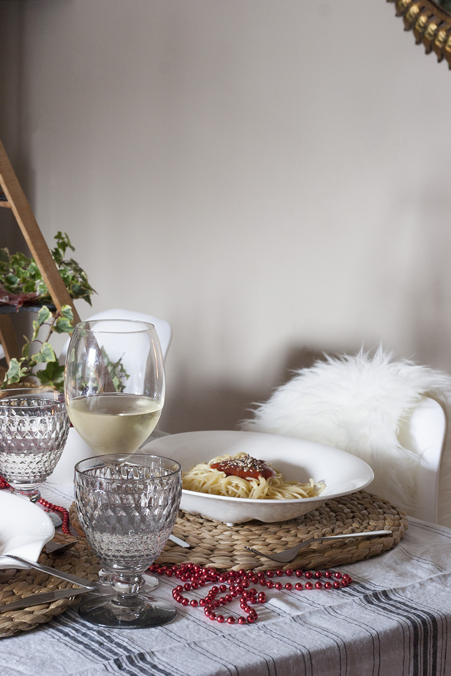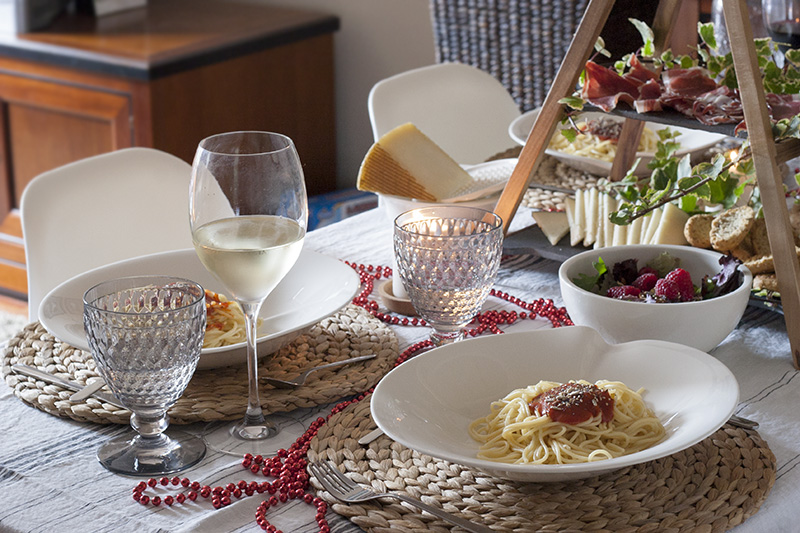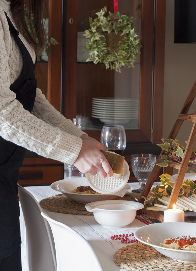 Para abrir boca, hoy os queremos enseñar esta mesa navideña diferente con la pasta como protagonista. Hemos usado los platos Pasta Passion de Villeroy & Boch, copas de agua de la colección Boston Colored Smoke, rayador de queso, y expositor de madera para el queso de la misma firma, que ya os enseñamos en el candy bar de la comunión del explorador.