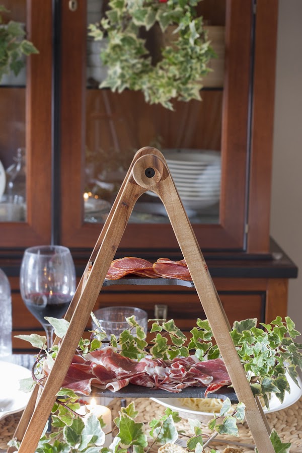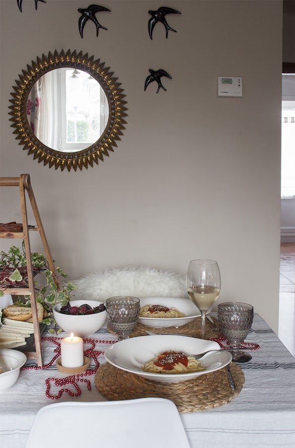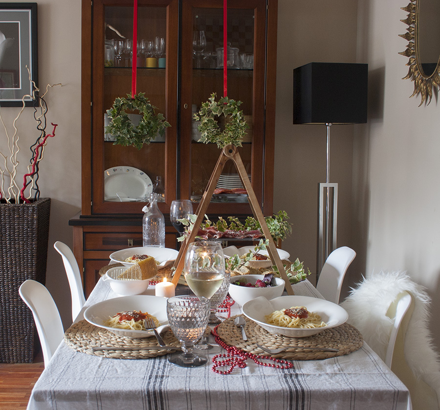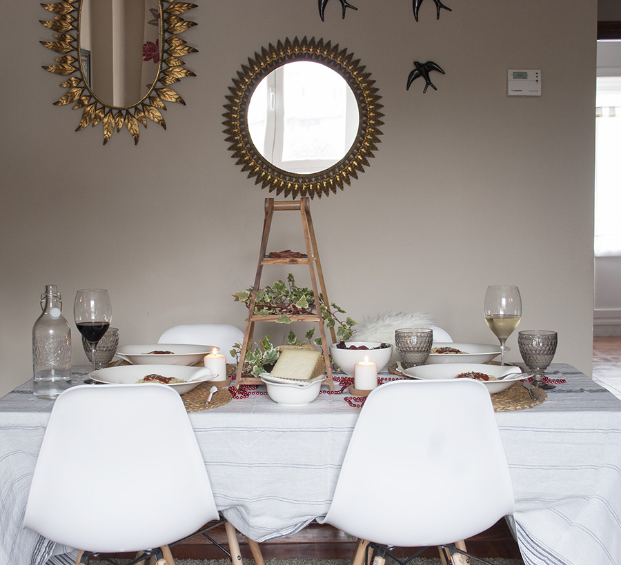En este caso, sólo hemos incluido una guirnalda roja de bolitas, unas velas y unas coronas de hiedra colgadas en las puertas del mueble. ¿Pensáis que esta mesa necesita algo más?