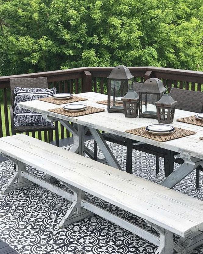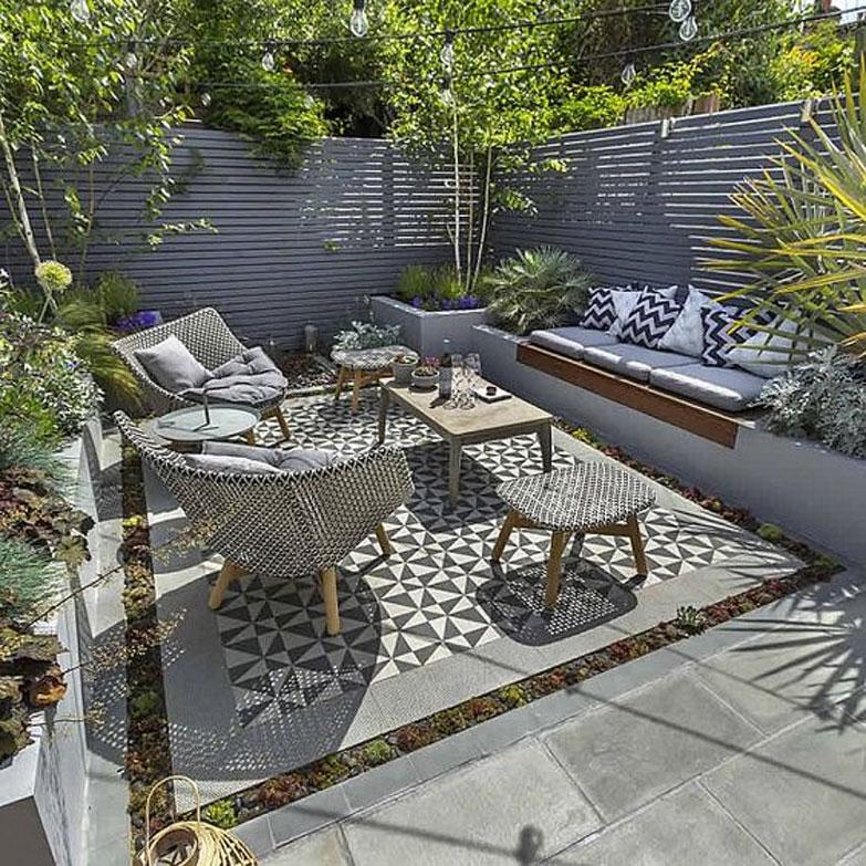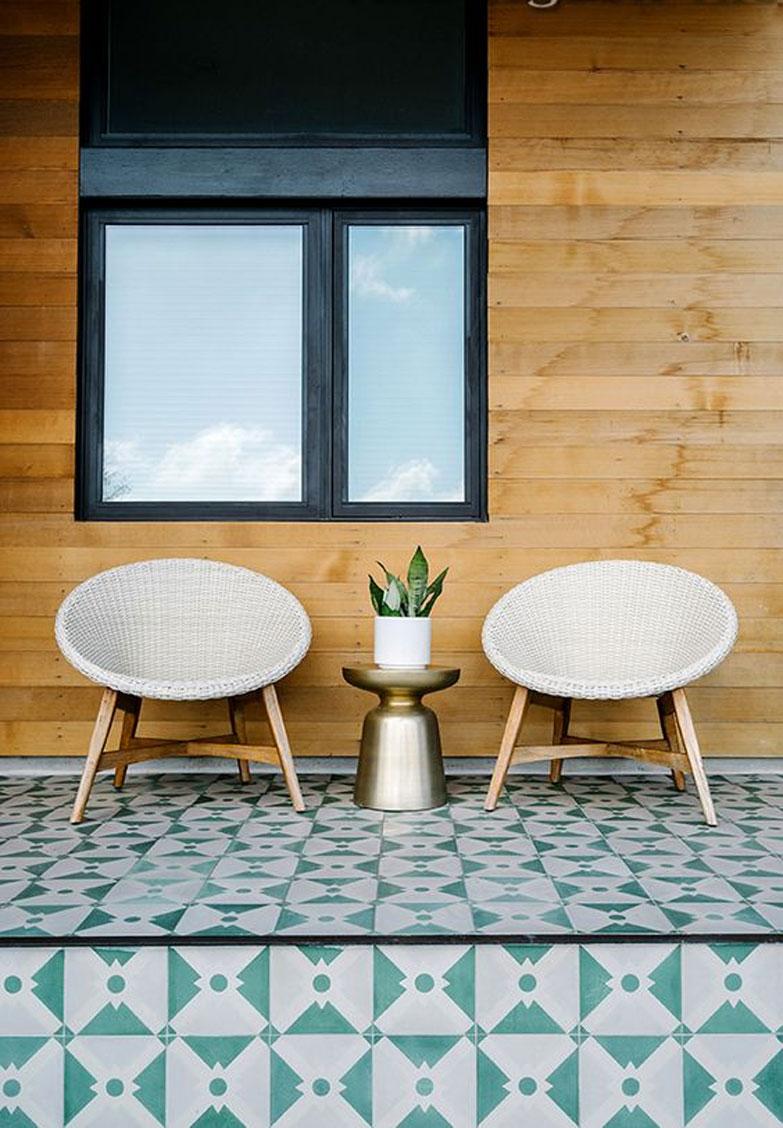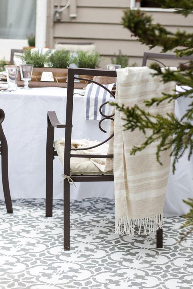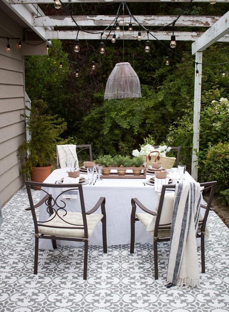 Vais a ver un montón de imágenes (no sólo del jardín de Emily Henderson), donde el atractivo radica en el suelo y con poco más, los espacios que se han creado son absolutamente apetecibles. Con sencillos bancos, pufs de rafia, sillas tipo Acapulco, faroles o incluso los clásicos conjuntos de jardín, sirven para tal fin. ¡Ah! importante no olvidar los textiles, sin ellos nada sería lo mismo, pero si el suelo es muy llamativo mejor elegir tonos neutros, porque lo que queremos conseguir hoy es que nuestro “prota” sea el suelo.