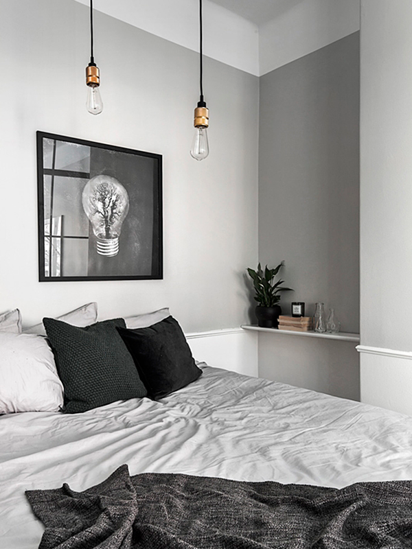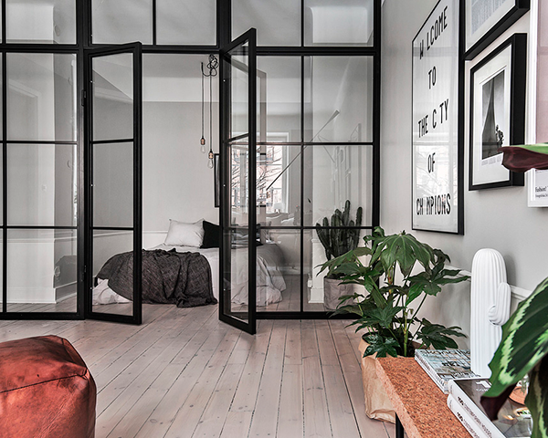 Amplios techos, muy luminoso y su único espacio decorado en el fantástico trio: Negro, Gris y Blanco. Tan elegante y masculino, como frío y acogedor. Un frente a cuarterones de vidrio y hierro, separa el dormitorio de la zona de estar. Pero mirándolo con detenimiento, parece que le falta una mano femenina, que le aporte algo más de color que el que le dan las diferentes plantas que tiene repartidas en la estancia.