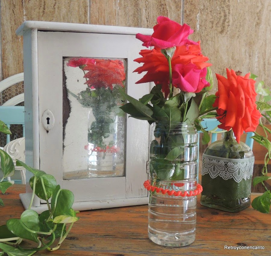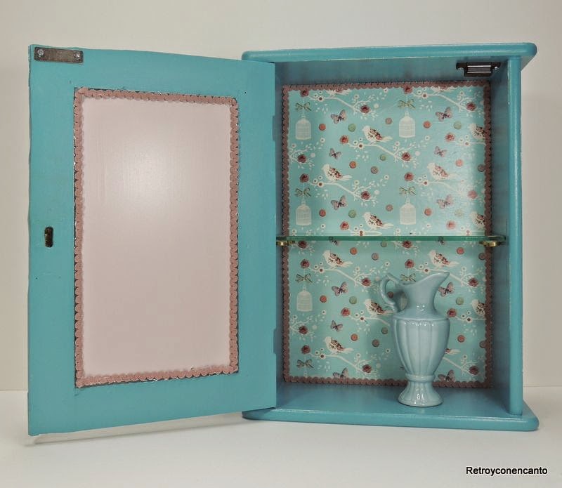 Espejo y estantería de cristal nueva, un poco de decoupage, detalles de pasamanería y sustituir la boca llave por un bonito tirador de bronce recuperado de un mueble antiguo.