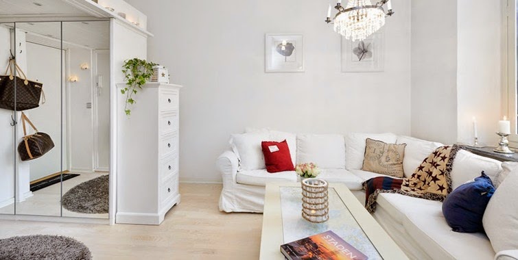 Una buena idea es poner espejos en el armario de la entrada (hacen más grande visualmente cualquier espacio), utilizar un sofá modular como pieza central en un tono claro o poner una cocina "importante" aunque la vivienda tenga pocos metros (le da ese carácter de casa "de verdad"). Os gusta?