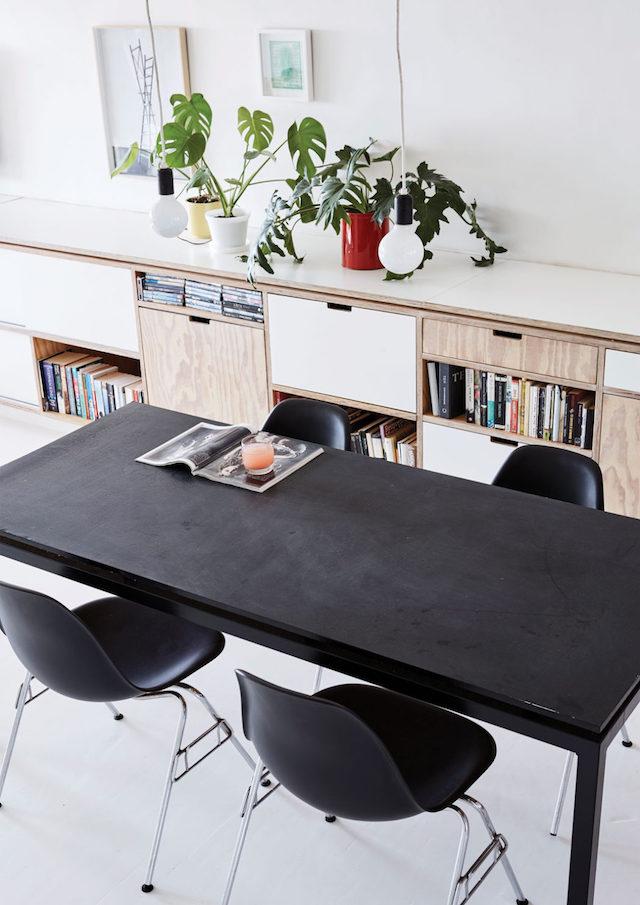 Fíjate que aunque el material principal sea la madera contrachapada, se incluyen otros elementos que aportan ese acento necesario para romper con la monotonía. Con piezas más pequeñas en otros tonos de madera, objetos de colección, deco, plantas, cuadros y elementos de contraste con el blanco tales como la mesa de comedor (negra) o el sofá en azul y la mesita y cojines amarillos…
