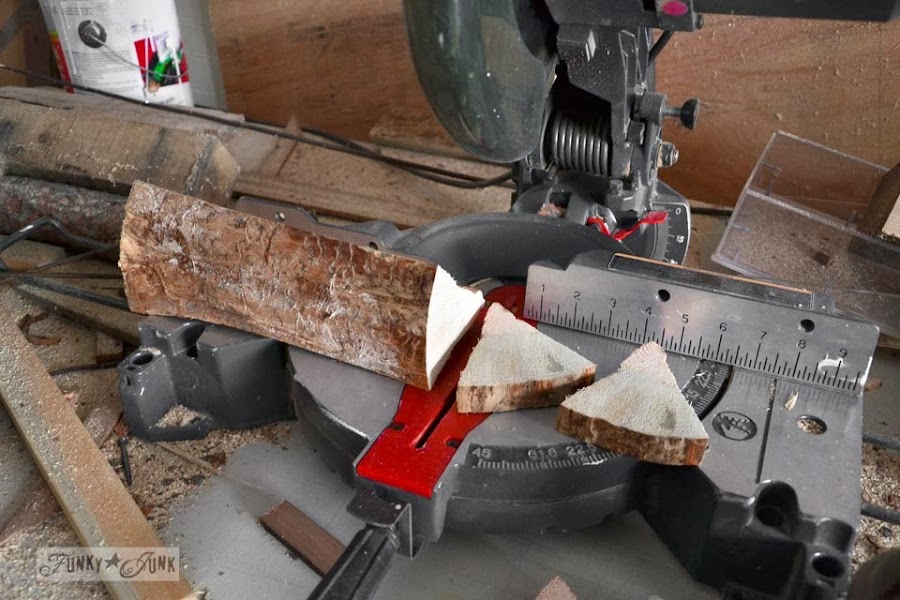 Con una sierra de inglete cortáis unos trozos de 2 cms de grosos aproximadamente.Y entonces comienza la diversión..... botones, una pinza de ropa sosteniendo hojas y una piña, todo pegado sobre los improvisados arboles. Como base te puedes servir de una tapa de frasco de conservas y engranaje oxidado, así como trozos de madera se convirtiran en los troncos de los árboles.
