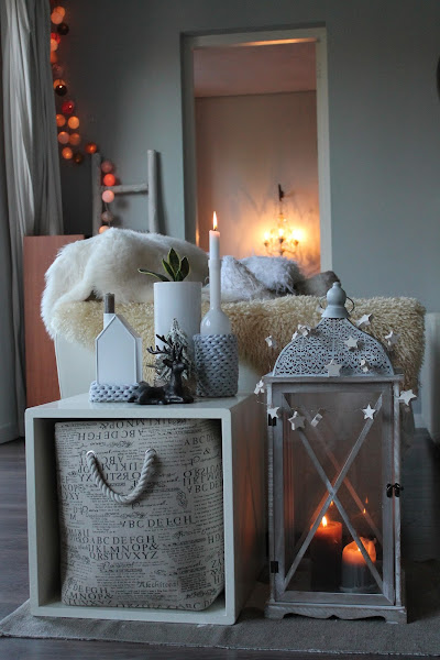 Al lado del sofá un cubo de madera donde tengo un canasto cuadrado el cual encaja perfectamente, allí las mantitas guardadas y a la mano para cuando tengamos frío, enzima adornos en blanco haciendo juego entre si, no es del todo navideño, pero dan el toquecito que nos hace pensar en ella, un ciervo y claro mi farol gigante, jejejeje, con un par de velas y al fondo luces de la marca Happy lights que hacen el ambiente romántico y acogedor.