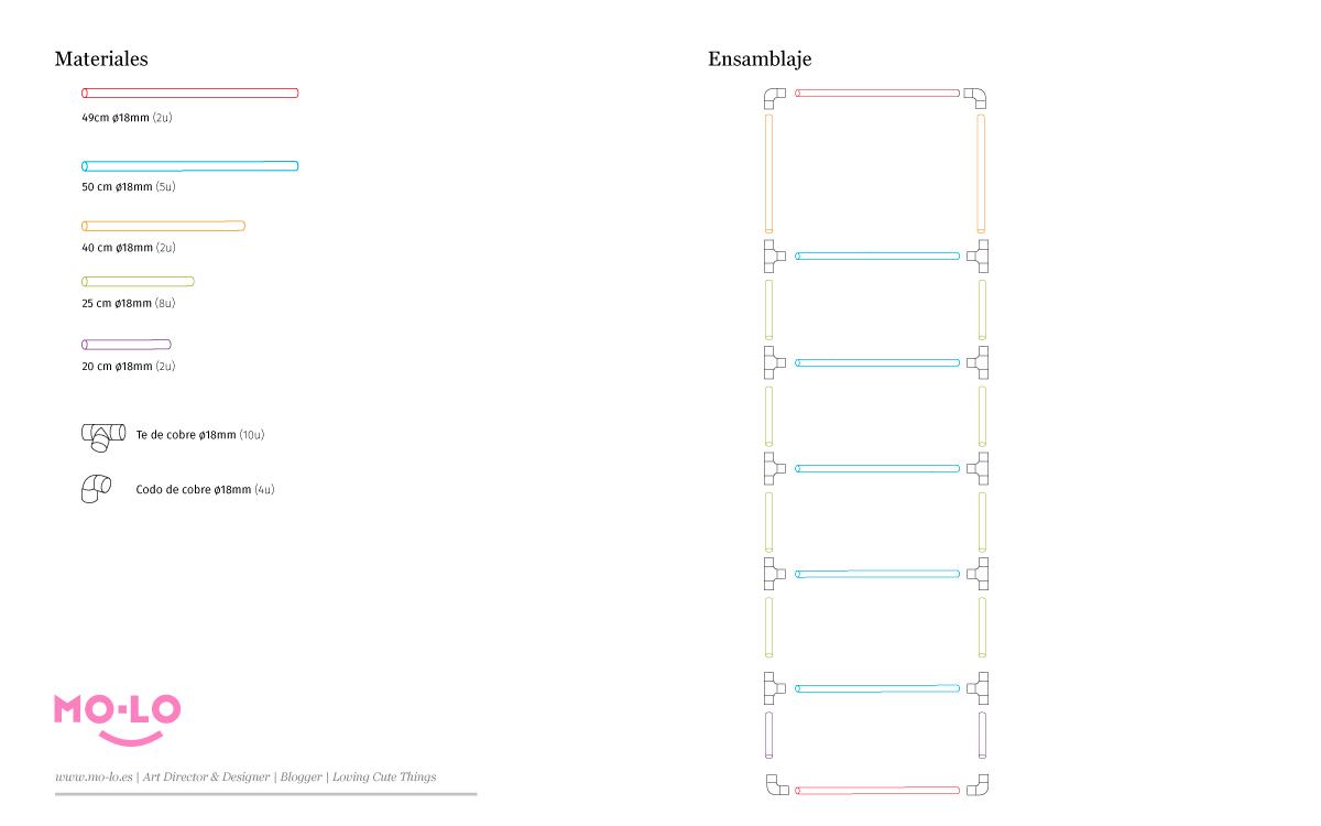 No os echéis las manos a la cabeza pensado dónde vais a cortar las varillas y con qué. Estoy segura que donde compréis, tanto las piezas de cobre como las varillas de pino, tienen servicio de corte. Así que, tranquilas, llevad el esquema y ¡a esperar a que os lo den hecho!