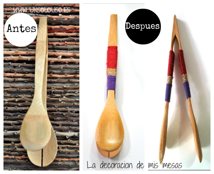 Este DIY que os presento, lo podéis hacer también con las cucharas y tenedores grandes de madera que encontráis en cualquier tienda o multiprecio, convirtiéndolos en unos precios cubiertos para servir.