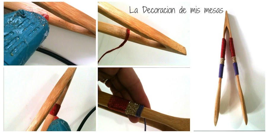 El proceso no puede ser más sencillo, elige los colores de hilo, lana, cintas ... y empieza poniendo una pizca de pegamento por la parte de atrás del cubierto, enróllalo varias veces, teniendo cuidado de que las vueltas queden rectas.