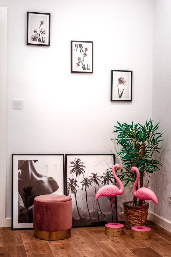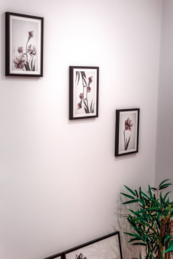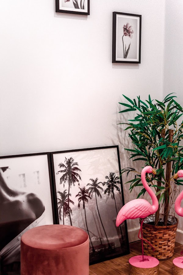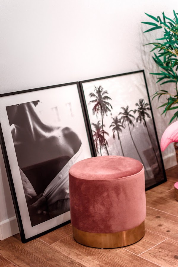 Si hablamos de cuadros, Desenio es mi marca favorita ya que en ella puedo encontrar todo tipo de láminas y marcos que se adapten a mis gustos. Para dividir el salón, hemos dividido la decoración en dos zonas, la que hoy os enseño es la parte donde irá el sofá, que por cierto, ya está de camino y no puede ser más bonito. Estoy enamorada, creo que cuando lo veáis os va a encantar. Como os decía, para la zona del sofá escogí cuadros bastante sencillos con el marco en color negro, como todos los que habrá en el salón y láminas sin demasiado color. Creo que recargar con mil colores es desacertado y los cuadros con fotos de tonos muy vivos no me gustan. Es por eso que me decidí por fotografías en blanco y negro para encima del sofá, unas sencillas palmeras o una preciosa foto artística que me inspiró nada más verla. Como veis, aún no he podido colgarlos, os enseñaré la estancia al completo cuando llegue el sofá. Y para el otro lado, una composición de tres cuadros con flores, de líneas sencillas y con un pequeño toque de color rosa, sin más.