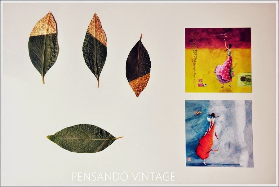 Pues estando en las fechas que estamos y tomando como referencia las hojas con purpurina del post anterior y haciendo un homenaje a las láminas de botánica que tanto me gustan, decidí dejar secar unas hojas al estilo tradicional, metidas en un libro, y pintarlas de forma parcial, unas con spray dorado y otras con purpurina, y este fué el resultado! Me gustó la textura tras dejarlas secar!