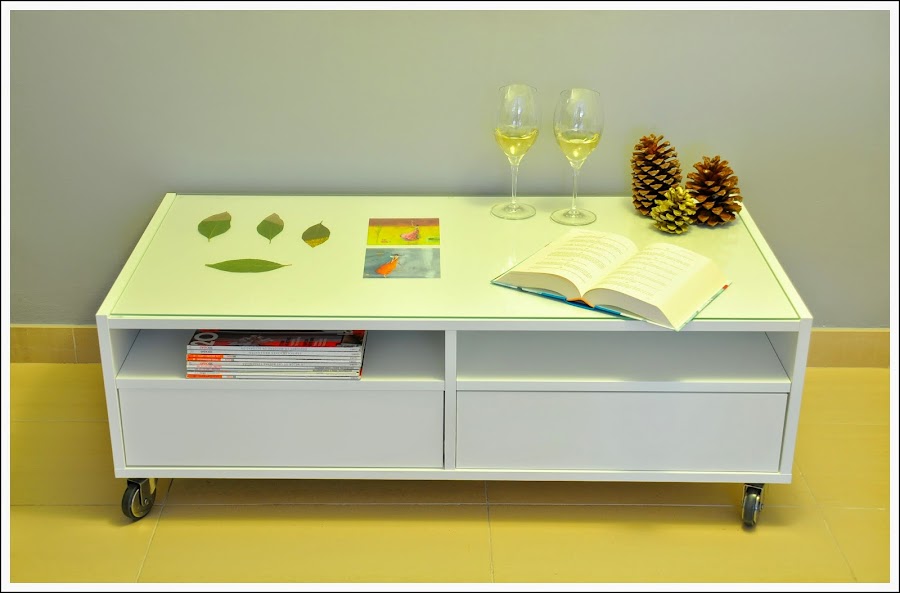 Hola a todos! Pues la mesa en cuestión es la Boksel rectangular de ikea, seguro que la has visto mil veces!! :-). Una mesa con ruedas, muy práctica y con una encimera en vidrio templado que da juego para personalizarla con cualquier cosa, con letras, fotografías, etc, lo único que tienes que hacer es levantar el vidrio y poner sobre la madera lo que se te ocurra!.