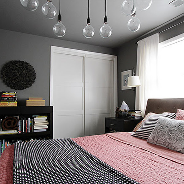 Tengo que reconocer que la base es buena el gris siempre es un buen aliado, un color al que "todo le va bien", con textiles bitono de Ikea, un pequeño plaid a juego y una lámpara que no deja indiferente a nadie, este dormitorio es una delicia para la vista, un lugar que cumple perfectamente su función estética y a la vez invita al descanso.