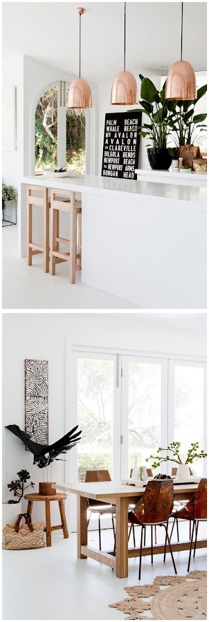 El cobre lo podemos encontrar con diferentes variaciones, en acabado mate o brillo, en un tono más vivo u otro más envejecido... El caso es que, a la hora de decorar con este color, tenemos un gran abanico de posibilidades que explorar dependiendo del efecto que queramos conseguir. Un buen ejemplo de ello son los dos comedores que os enseño a continuación donde el cobre hace aparición en un tono brillante y dando un aire más vanguardista en forma de lámpara de techo o bien en un tono más envejecido, lo que le da un toque más clásico a las sillas del comedor de la segunda foto. Aunque, también hay que destacar, el equilibrio perfecto que se consigue entre el toque clásico del cobre envejecido con la modernidad del diseño de la silla, admirable.