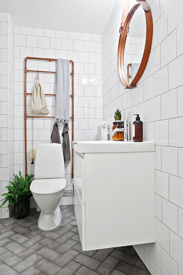 De este cuarto de baño apreciamos el cobre en el espejo circular, que si queréis aprender a hacer uno igualito al de la imagen os dejamos el tutorial aquí, y en el conjunto de tuberías que sirven a la vez de toallero, ¿no es brillante?. Las tuberías de cobre, un elemento que siempre ha sido muy usado en el ámbito arquitectónico y como material de construcción en temas de electricidad y fontanería que antes siempre se intentaba esconder y que, hoy en día, pasa a ser un elemento decorativo más como cualquier otro.