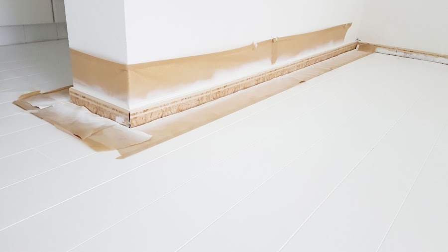 Para colocar el parquet es necesario instalarlo encima de un suelo ya plano, en nuestro caso, lo instalamos encima de las baldosas que ya teníamos, pero siendo sinceros, no nos queríamos embarcar en arrancar el rodapiés de baldosa y colocar uno de madera, ya que eso supone más gasto, más trabajo y más tiempo, así que después de darle unas cuantas vueltas encontramos la solución perfecta, ¿Sabéis cuál fue?, Pues sí!, decidimos pintarlo con spray.