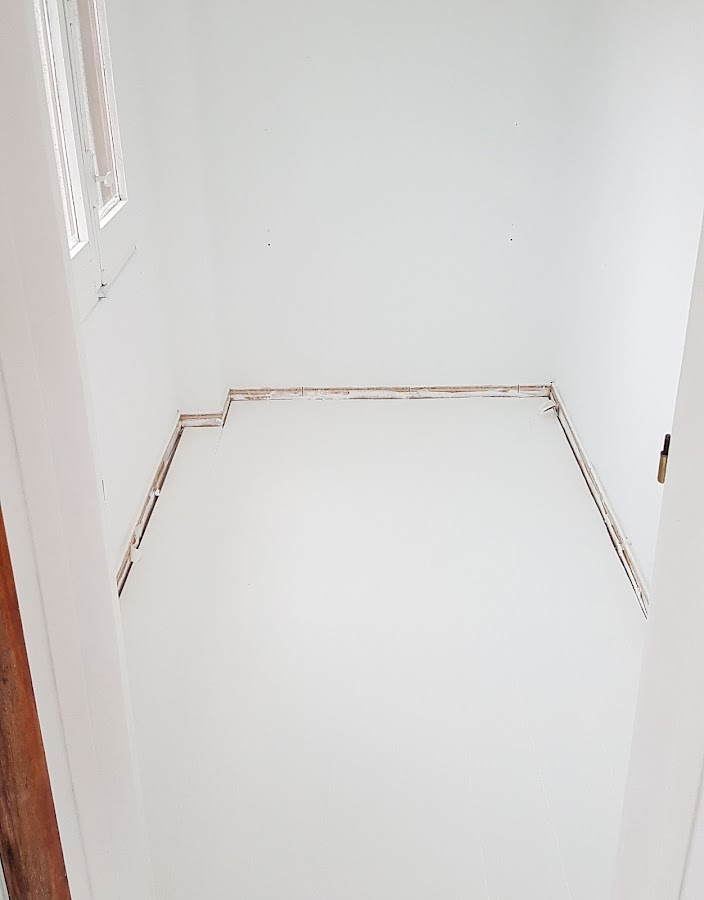 Así se veía nuestro zócalo sin pintar y sin nada. Como véis, el suelo ya era blanco pero el zócalo seguía ahí. Lo normal hubiera sido arrancarlo antes de nada, alisar la pared, y colocar el parquet pero nosotros nos saltamos todo ese paso.