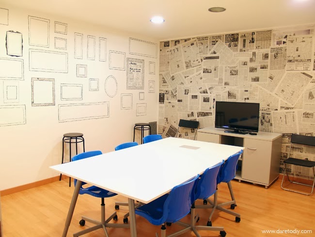 También actuó en la sala reuniones creando una pared llena de marcos y otra la forraron con recortes de papel de periódico ¿vistoso no?