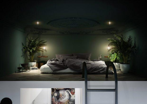 Pero no se si me gusta mas esa idea, o como se mimetiza y casi oculta el dormitorio de la entreplanta donde la luz (con su foco tan detallado) y las plantas, le dan ese toque romántico con el que se acompaña el floron y moldura del techo.