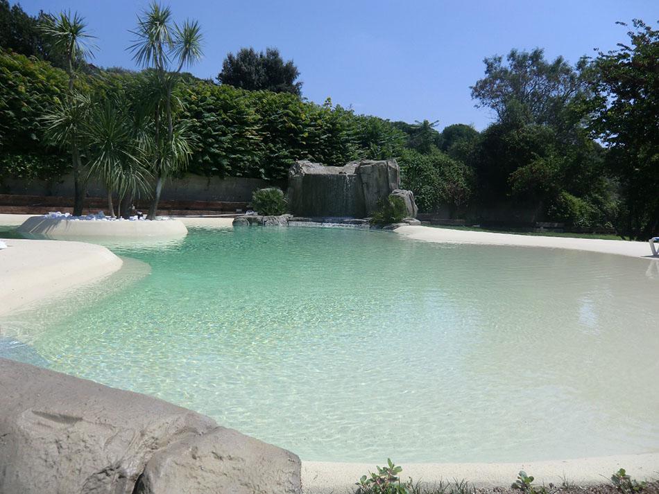 Fuente: BioPiscinas de Arena Después el hormigón se reviste de una arena especial (en realidad son varias capas de arena compactada) para conseguir una superficie suave y natural, antideslizante tanto en seco como en mojado, y que no se caliente demasiado con el sol. La piscina se completa con un paisajismo especial que puede incluir rocas, vegetación silvestre, pequeñas cascadas Todo depende del espacio y de las preferencias de cada uno.