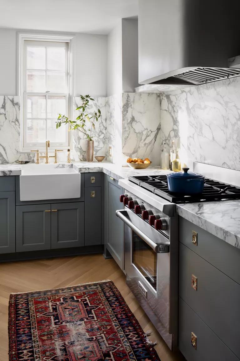 La cocina como veis es una estancia más, no está abierta. Al no ser muy grande y tener una sola ventana, la intención era no abigarrarla, así que se amuebló sólo la parte inferior. La superior se cubrió a media altura con un salpicadero de la marca ABC Stone, dejando el resto sencillamente pintado, lo que hace que parezca más amplia y desaparezca el ruido visual. En el centro se colocó una alfombra antigua de Frances Loom.