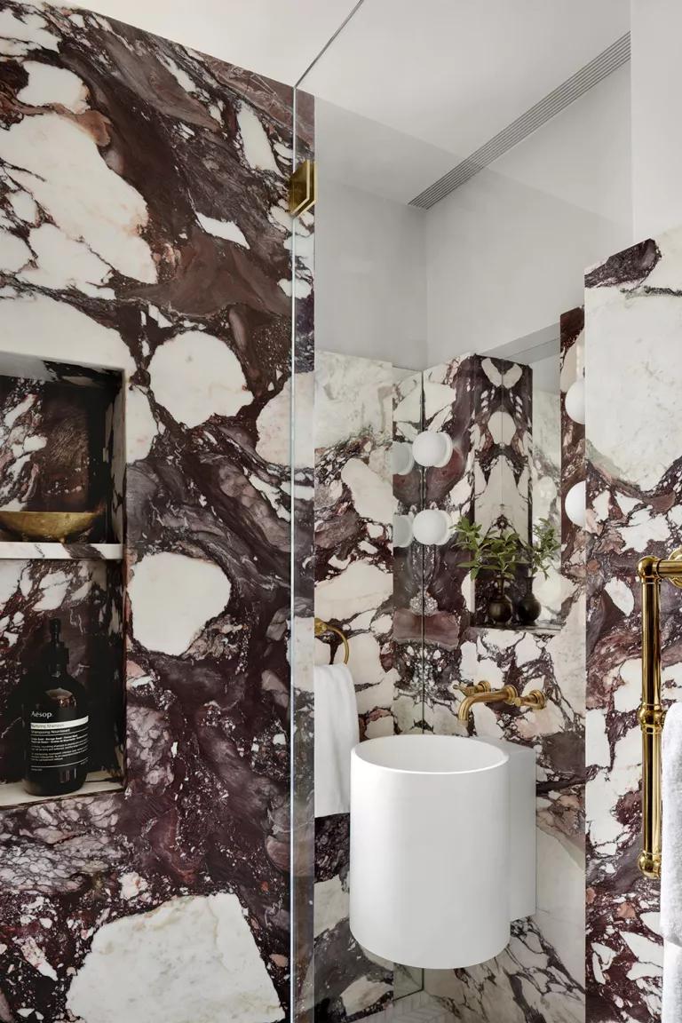 El baño es un resumen de la idea arquitectónica de este apartamento. No por pequeño siempre tenemos que ir al blanco, hay otros recursos que nos hacen agrandar los espacios visualmente, en este caso es el modelo Viola de mármol Calacatta en gran formato, cuyo dibujo se difumina en la pared haciendo que las esquinas se pierdan, los límites de la habitación se desdibujan y el espacio parezca mayor. Su brillo, así como los espejos, también ayudan a crear esta sensación. Aquí en el baño, es donde el arquitecto se ha quedado a gusto con la opulencia que le caracteriza :-)