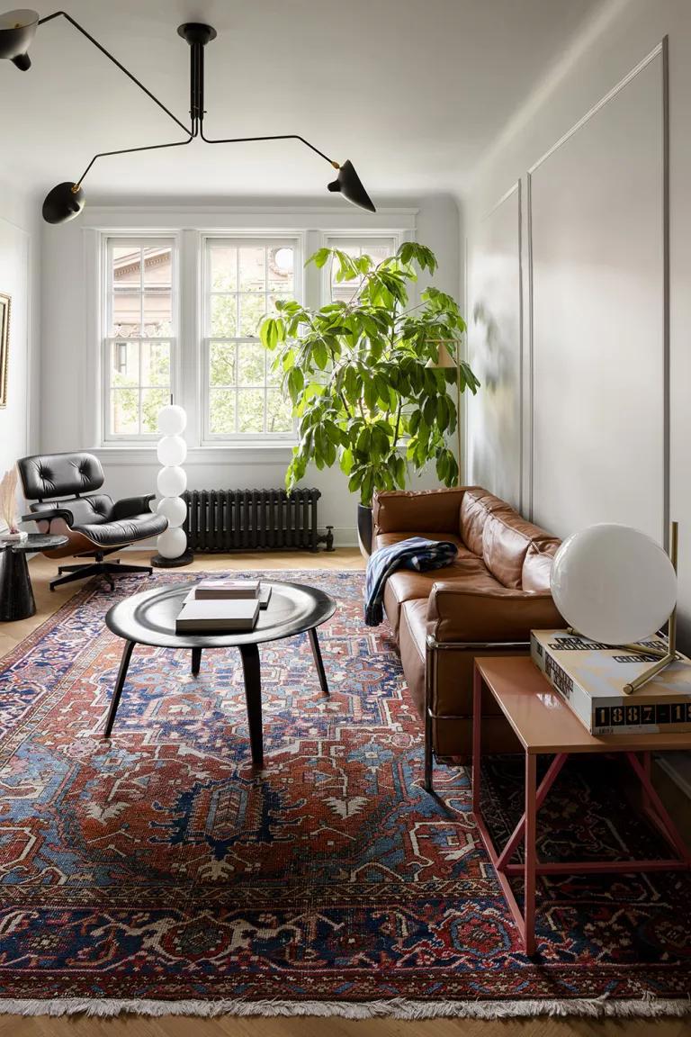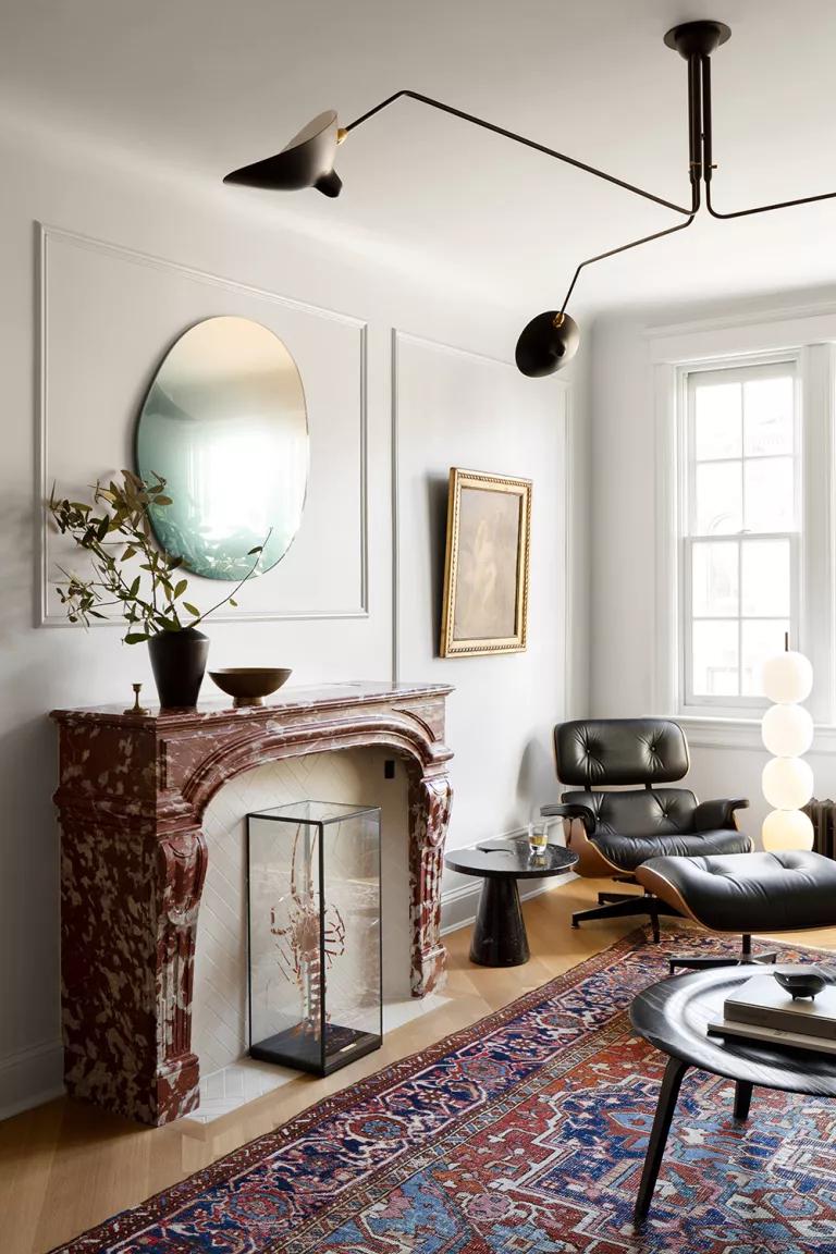 El cuarto de estar tiene todo lo necesario a pesar de no ser de grandes dimensiones. La chimenea se colocó como punto focal y esconde un secreto, oculta la televisión que se encuentra dentro de la repisa y sale gracias a un ascensor motorizado. De ahí que sea sólo una chimenea decorativa, si os fijáis bien en la foto, los azulejos blancos colocados en espiga que forman parte de la trasera de la chimenea están adelantados con respecto a la pared, eso es porque detrás de los mismos se encuentra el hueco que da cabida a la televisión. Si tenéis el ojo muy fino, también se aprecia en la parte superior, la rendija por donde sale el aparato electrónico. Sin duda una idea ingeniosa a la par que elegante. Para acompañar una chimenea tan especial, los clásicos del diseño hacen acto de presencia en el salón con piezas de Charlotte Perriand, Le Corbusier, o Serge Mouille, entre otros.
