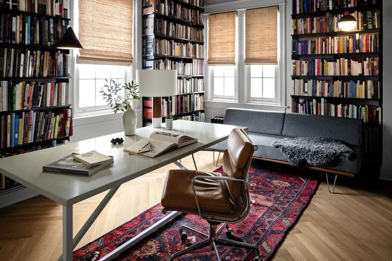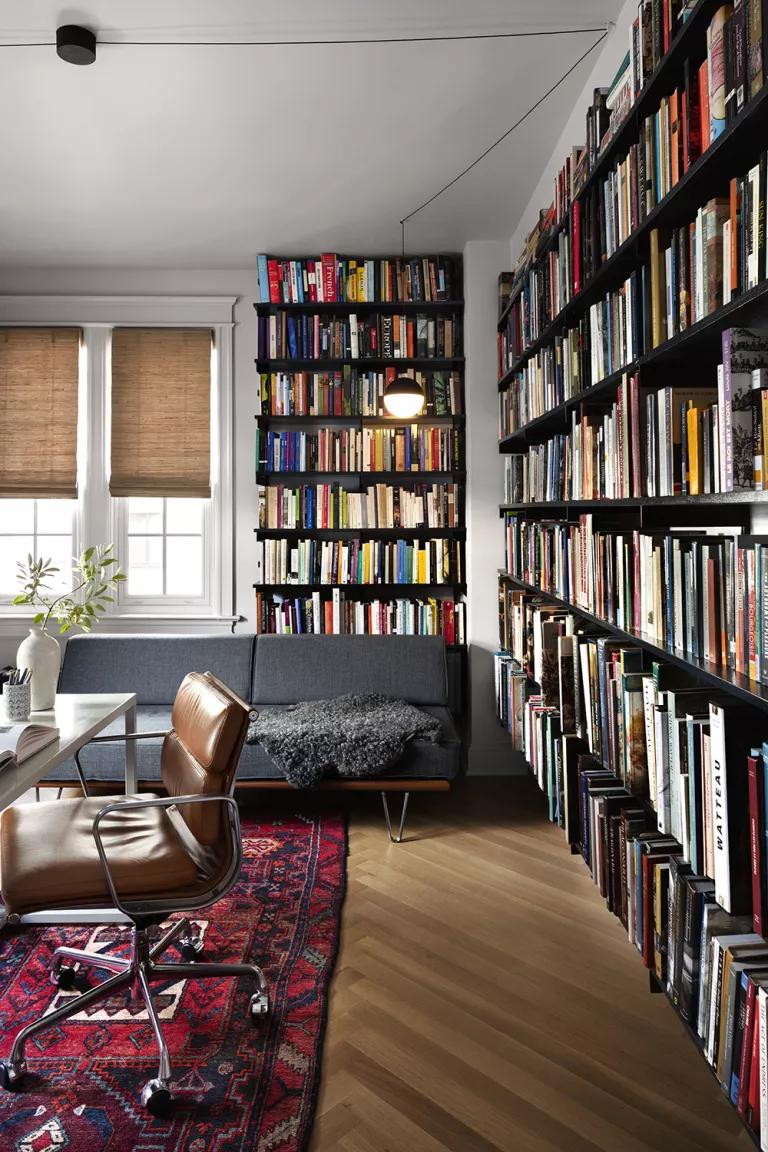El segundo dormitorio se convirtió en despacho y biblioteca. La enorme cantidad de libros está inventariada como en las librerías, por temática (interiorismo, arte, historia, etc.) El reto era grande cuando llegaron a la casa, dar cabida a tal cantidad de libros no es tarea fácil así que construyeron un sistema de estanterías flotantes y redujeron el tamaño entre estantes logrando así, más espacio de almacenaje. Aunque este no es el único espacio dedicado a los libros en la casa, en la entrada se le destinó otro espacio, también en el dormitorio principal y en el pasillo.