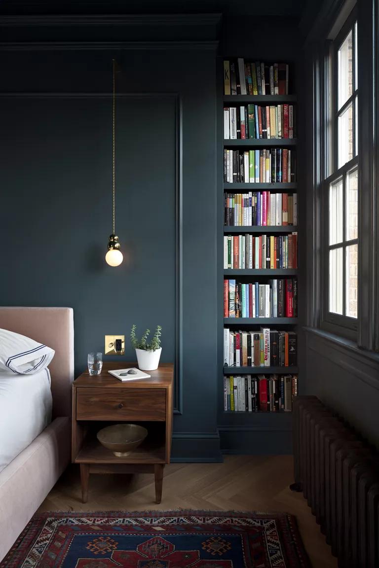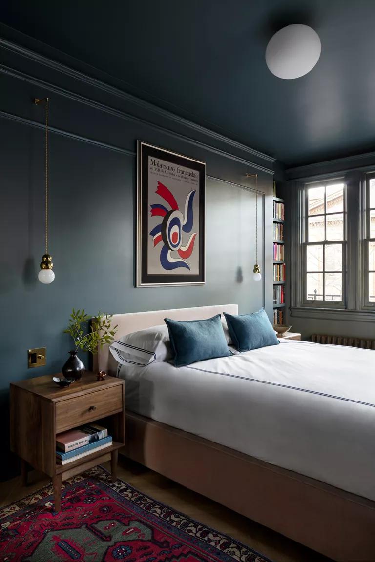 El dormitorio principal, que es el que recibe mayor cantidad de luz natural, se permitieron pintarlo de un bonito azul grisáceo para compensar la luminosidad del resto de la vivienda (el color es Inchyra Blue de Farrow and Ball). Al igual que las luminarias del comedor, las sutiles lámparas colgantes a los lados de la cama son de Michael Anastassiades.