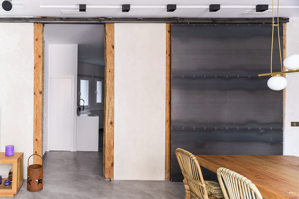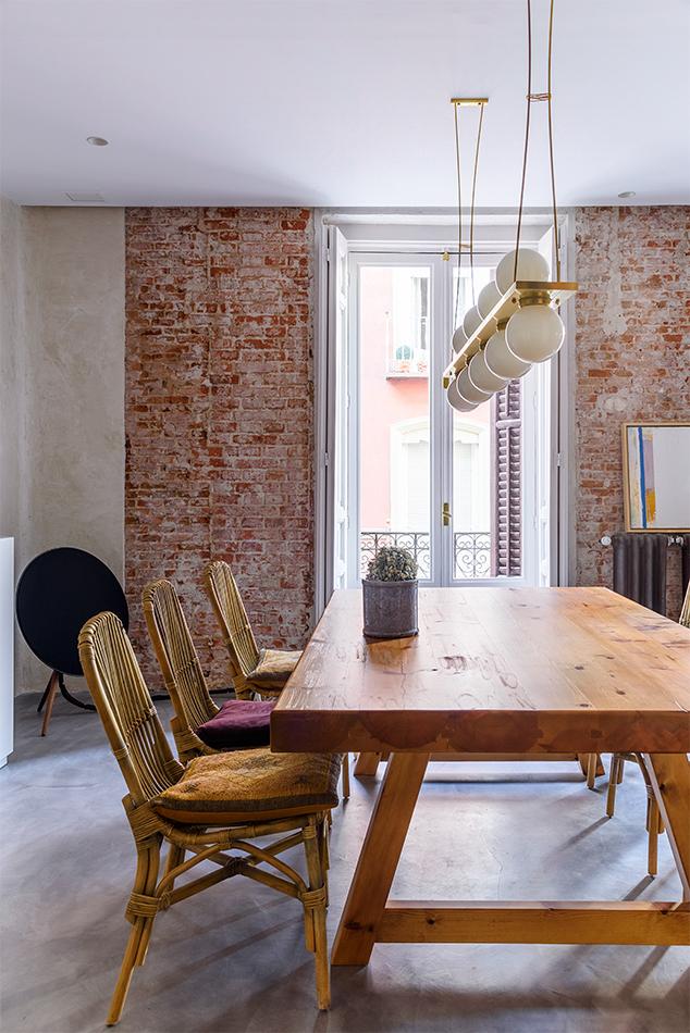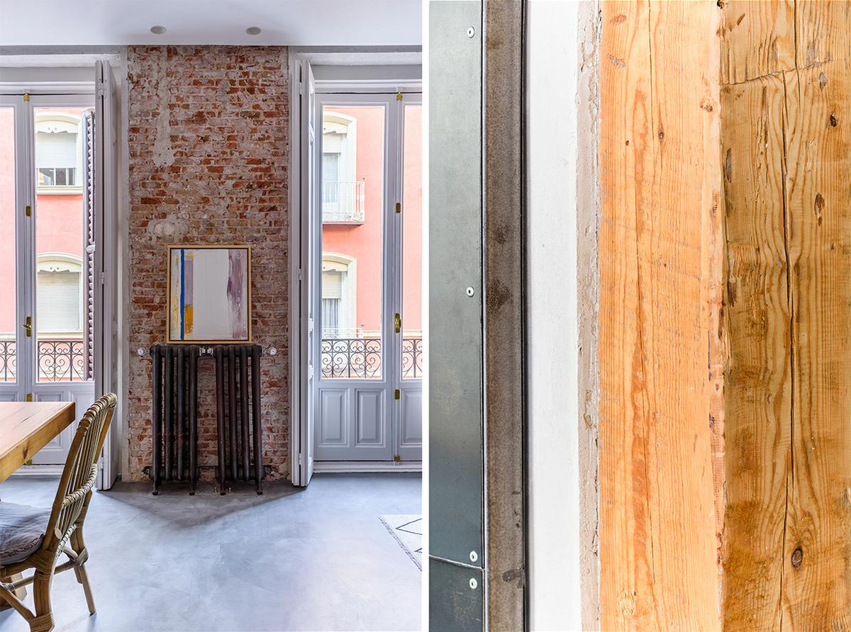 Los materiales más vanguardistas conviven con elementos arquitectónicos originales de la época, como pueden ser las vigas de madera o los muros de carga de ladrillo visto. La continuidad en los espacios se ha conseguido no solo abriendo y unificando estancias, sino a través de un suelo de microcemento que se extiende por toda la planta.