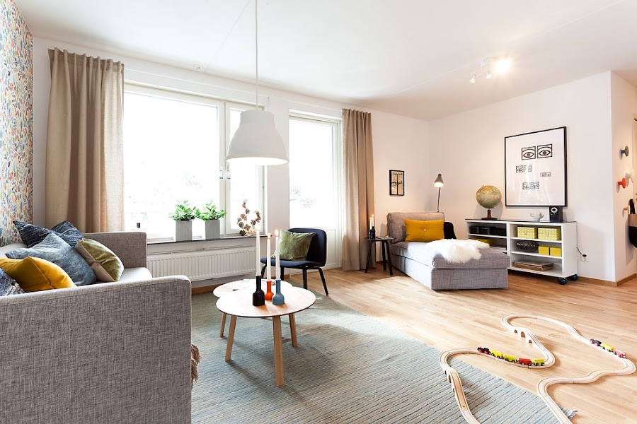 Por lo general la decoración de estilo nórdico se base en la utilización de color neutros y mobiliario sencillo y práctico. Los colores como el blanco y el gris, suelen ser los reyes de esta decoración, al igual que los muebles de madera natural o los lacados en blanco. El piso de hoy tiene todas estas características en cuanto a colores y muebles prácticos y funcionales, pero también tiene muchos toques de color y una gran variación de patrones.