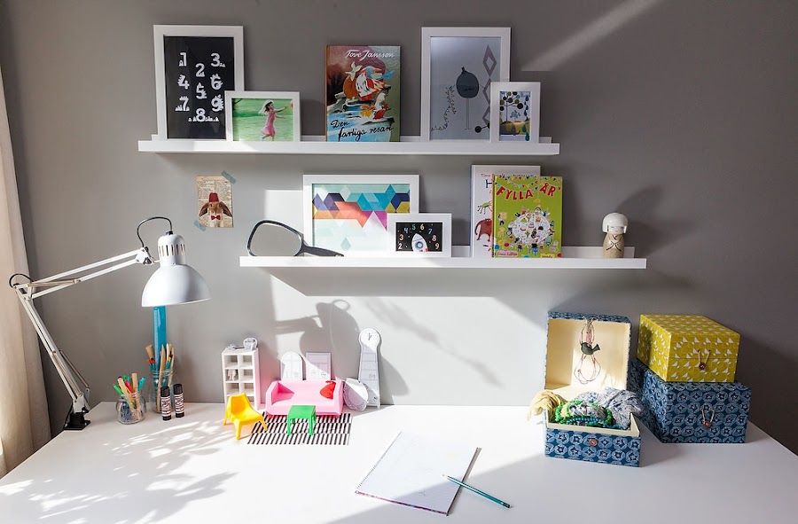 Las baldas para laminas sobre el escritorio permite tener un espacio donde exponer sus dibujos y las cosas que más le gustan. Me encanta esta idea.