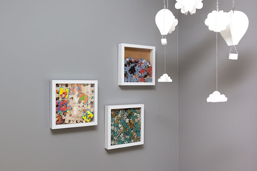 Sobre la butaca, un par de bonitas ideas para decorar las habitaciones infantiles. Como este móvil de nueves y globos, o los marcos llenos de piezas de puzle.