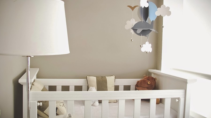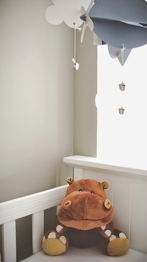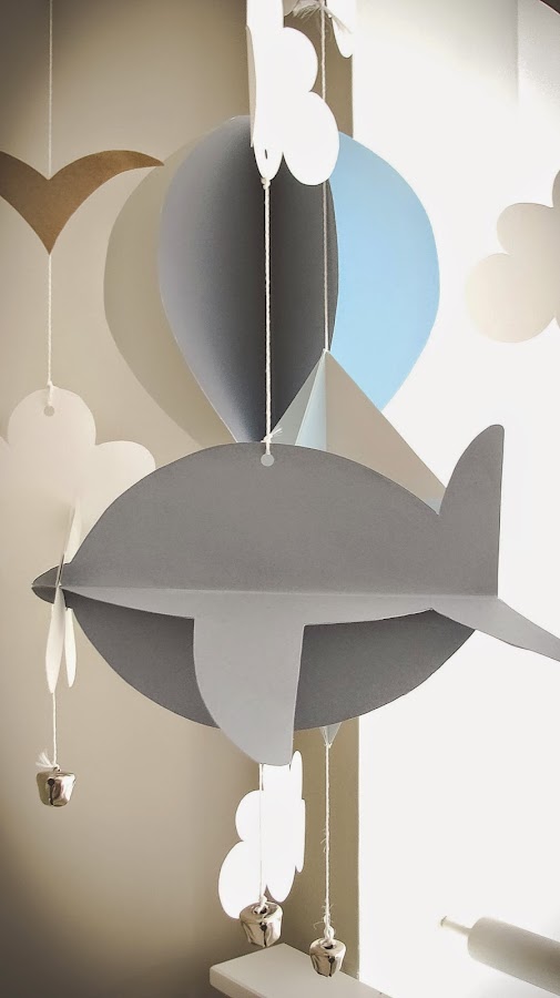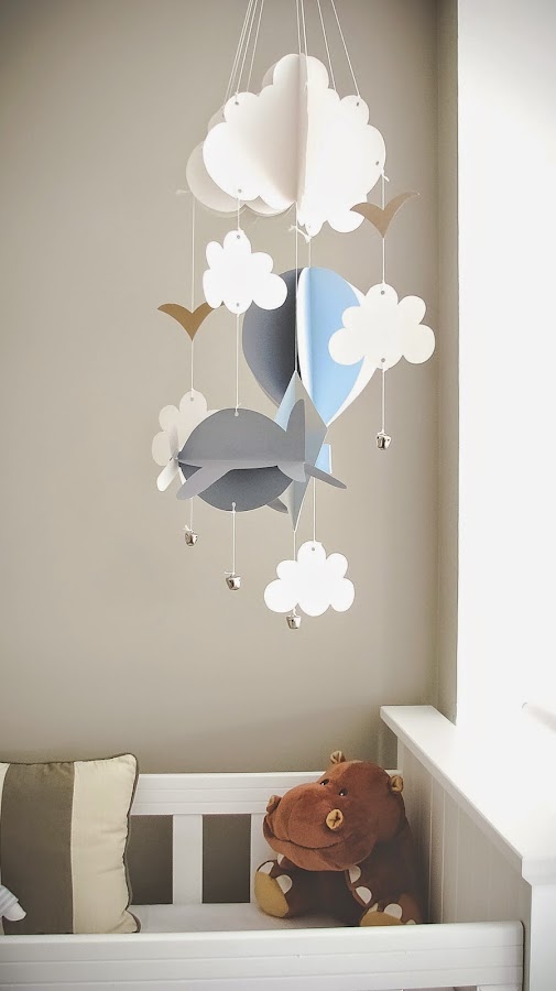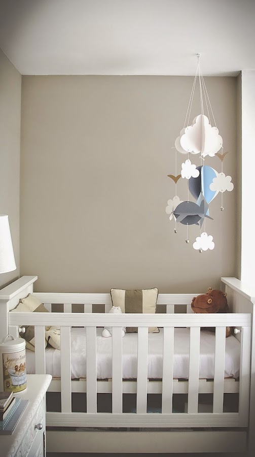 El móvil sobre la cuna lo hice yo misma con papel de alto gramaje y le agregué unos detalles de cascabeles para que tenga sonido.