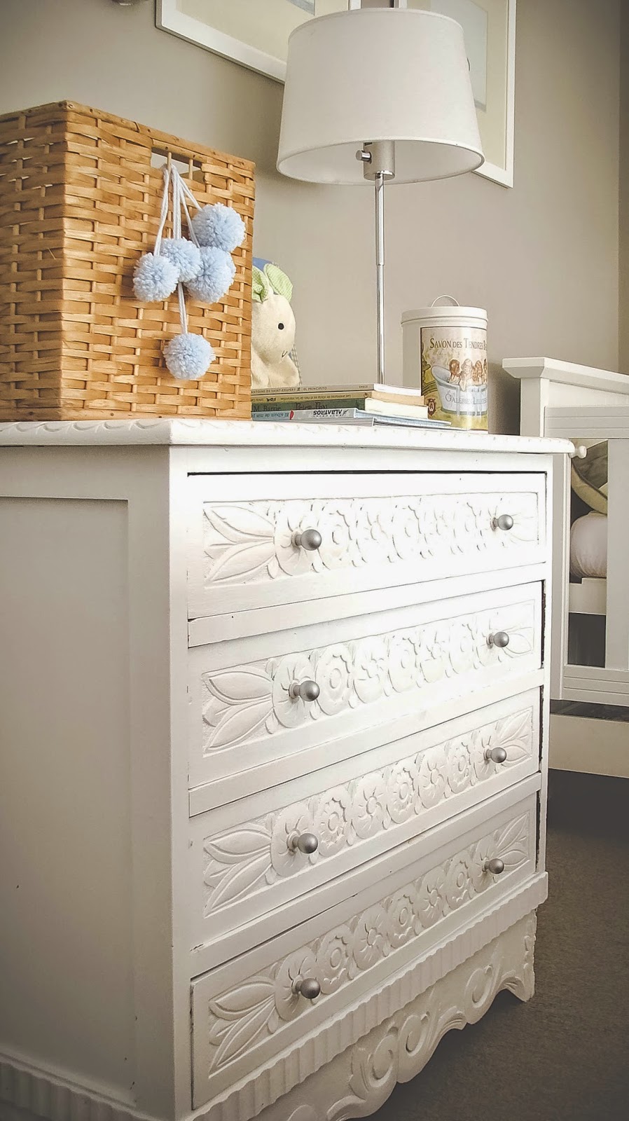 La cómoda fue heredada y la restauré pintándola de blanco y cambiándole los tiradores de los cajones.