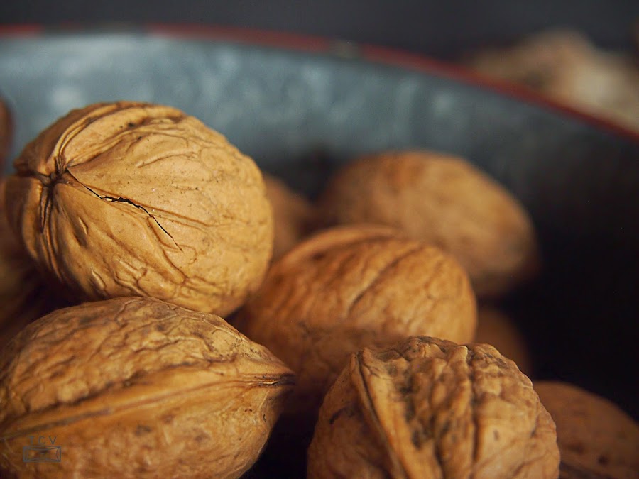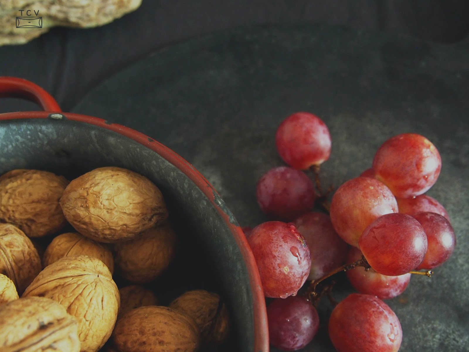 He elegido una composición muy otoñal, y de colores melancólicos, que es como me pone a mí esta estación. Un bodegón en tonos tierra con productos de temporada, nueces y uvas.