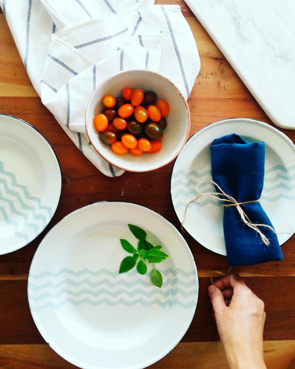 El hierro esmaltado es un material que antiguamente se usaba con frecuencia para hacer menaje y utensilios de cocina. El esmalte que se le aplica es porcelánico, muy resistente, y a su vez el hierro es irrompible, así que es más duradero que el menaje de cerámica, loza o vidrio. Sin embargo, durante unos años se consideró tóxico este tipo de material, sobre todo en combustión con el calor, así que hoy día se han mejorado los procesos de fabricación y estos platos son totalmente inocuos. En este caso, el esmalte porcelánico se les aplica artesanalmente y los platos tienen los detalles típicos de la fabricación artesanal.