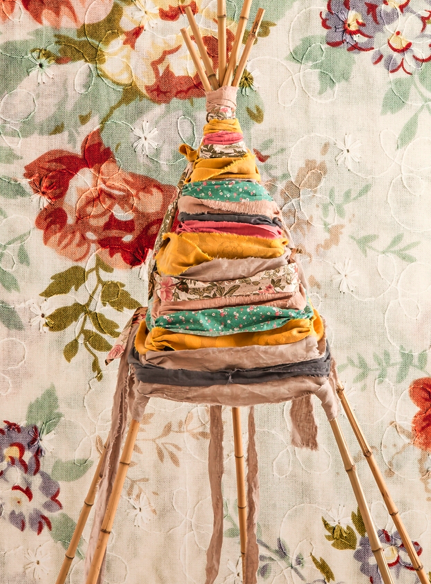 Ahora, te vas a la cocina y te tomas una coca- cola o un cafetito, lo que sea que te dé energía porque tienes que cortar muuuuchas tiras de tela. Las tiras deben tener 8 cm de anchura más o menos. Empezamos haciendo un nudo en la cruceta superior del tipi y vamos enrollando alrededor de la estructura. Cuando se nos termine la tira con la que estamos trabajando, la unimos a la siguiente con un simple nudo y continuamos.