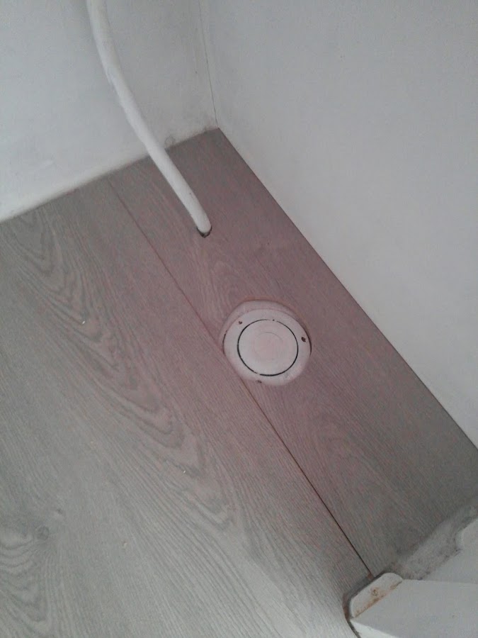 Otra de las dificultades con las que me he encontrado, es que la instalación de fontanería de la caravana se compone de unos pulsadores redondos que van en el suelo, por lo que he tenido que hacer unos agujeros en el parqué.