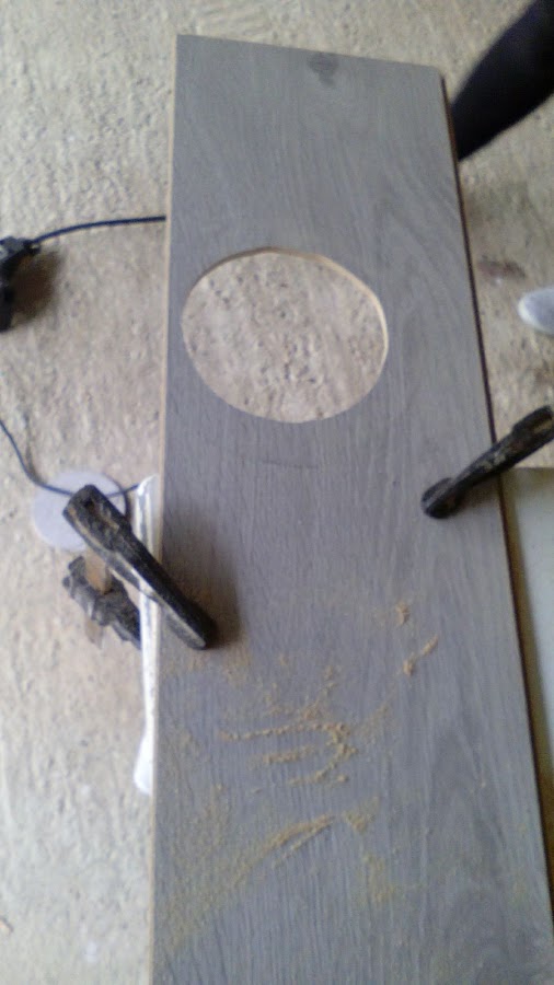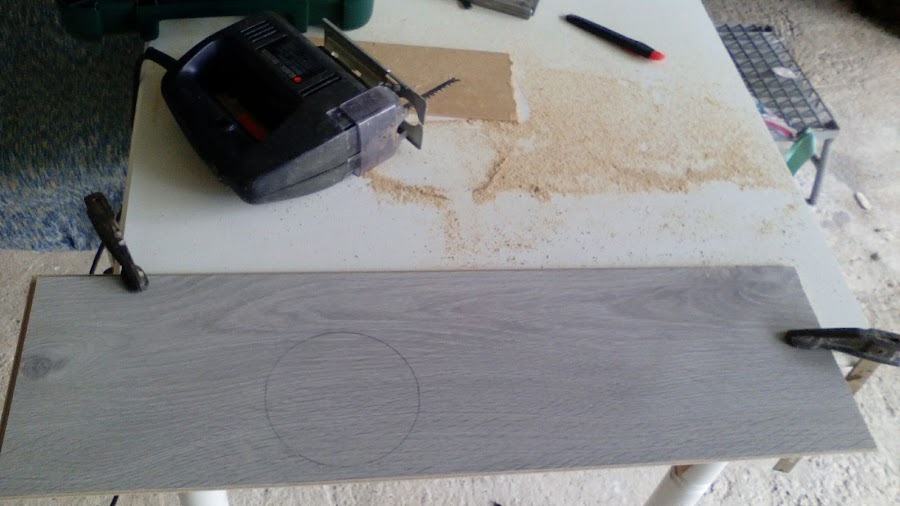 Para ello lo primero que he hecho ha sido marcar el circulo, ayudándome de una escuadra, un metro y un plato del mismo diámetro. Lo mas difícil ha sido centrar bien el agujero, pero midiendo y un poco a ojo no ha quedado mal del todo, de todos modos he hecho el círculo un poco mas grande para que no me quedara el suelo levantado.