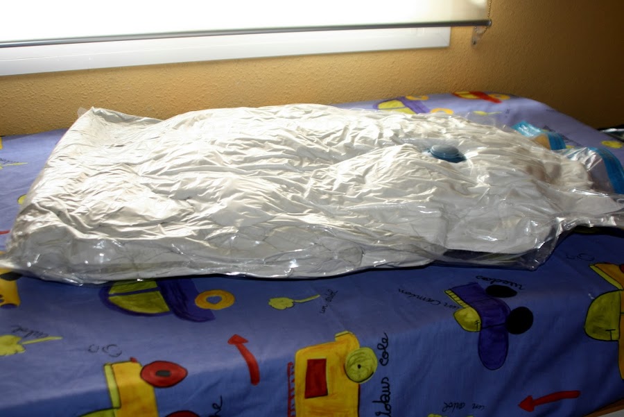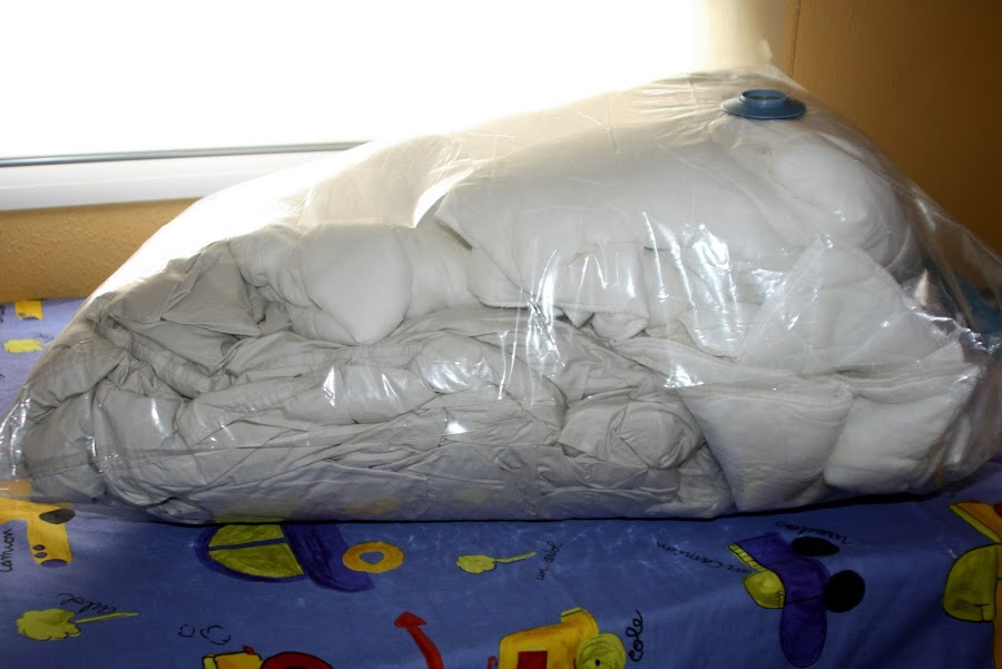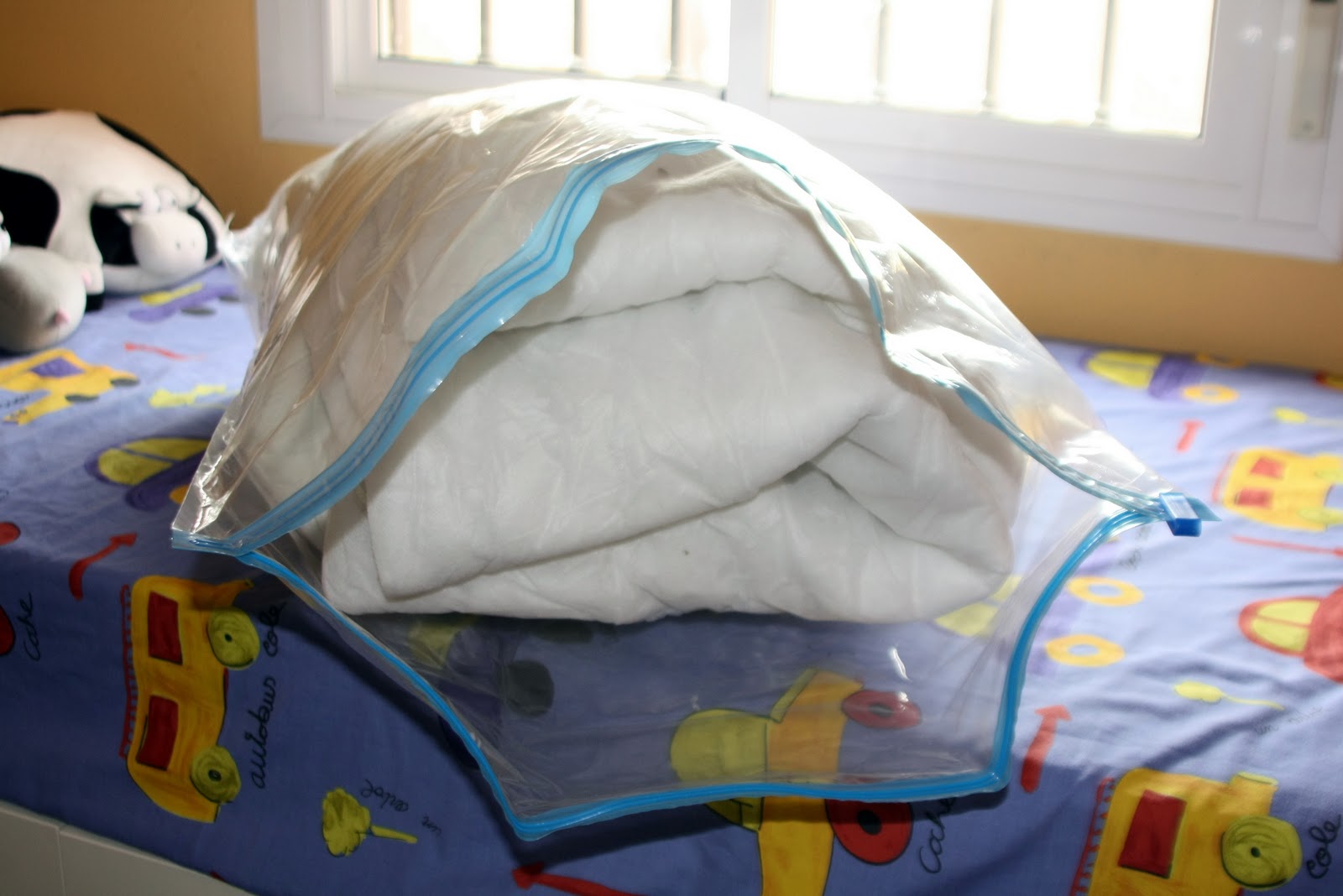 El mismo sistema lo usé para guardar los edredones nórdicos. Para eso compré estas mismas bolsas, pero de mayor tamaño. Aquí si que es espectacular la forma en la que se reduce el volumen de la bolsa una vez aspirado el aire interior.