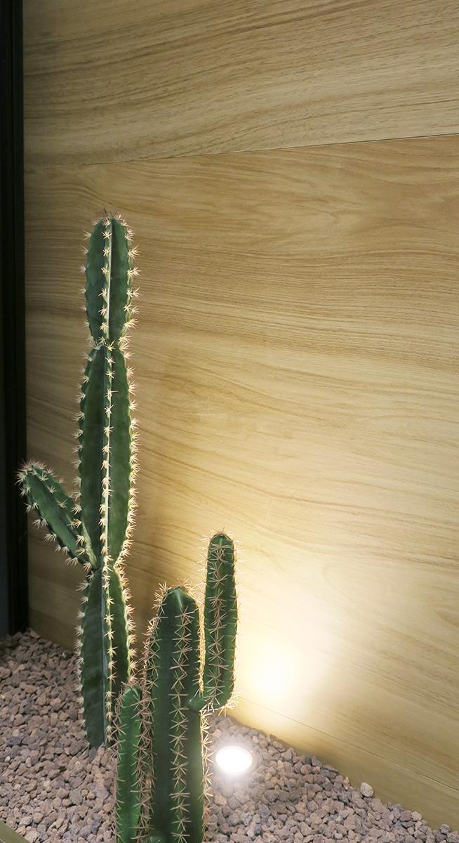 Una de las primeras propuestas que vimos fue esta composición para una terraza con pared de microcemento impermeable. Como ves, tiene una cortina de agua en una zona de la pared.
