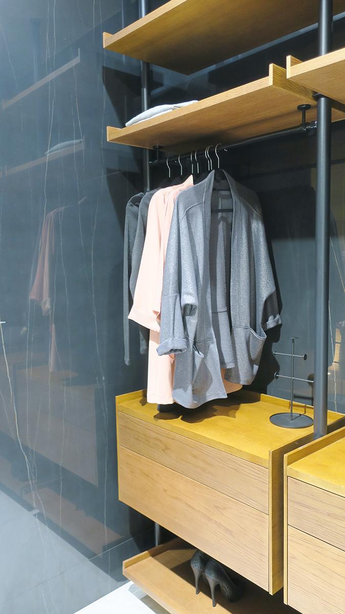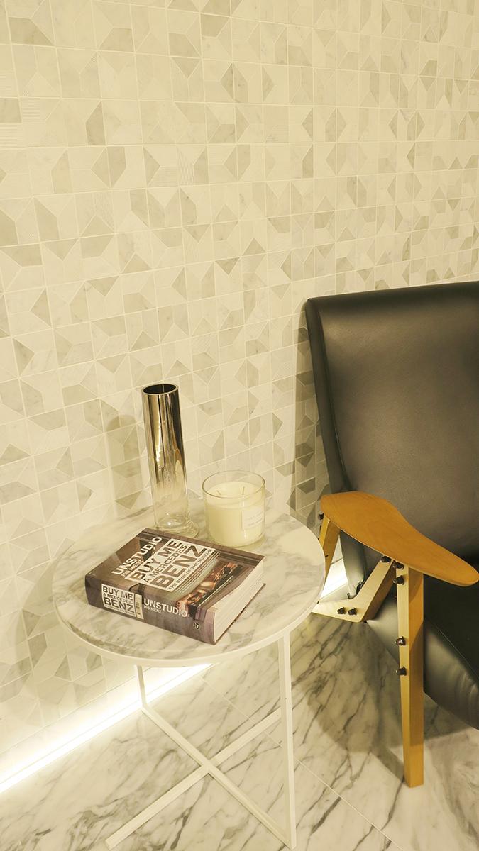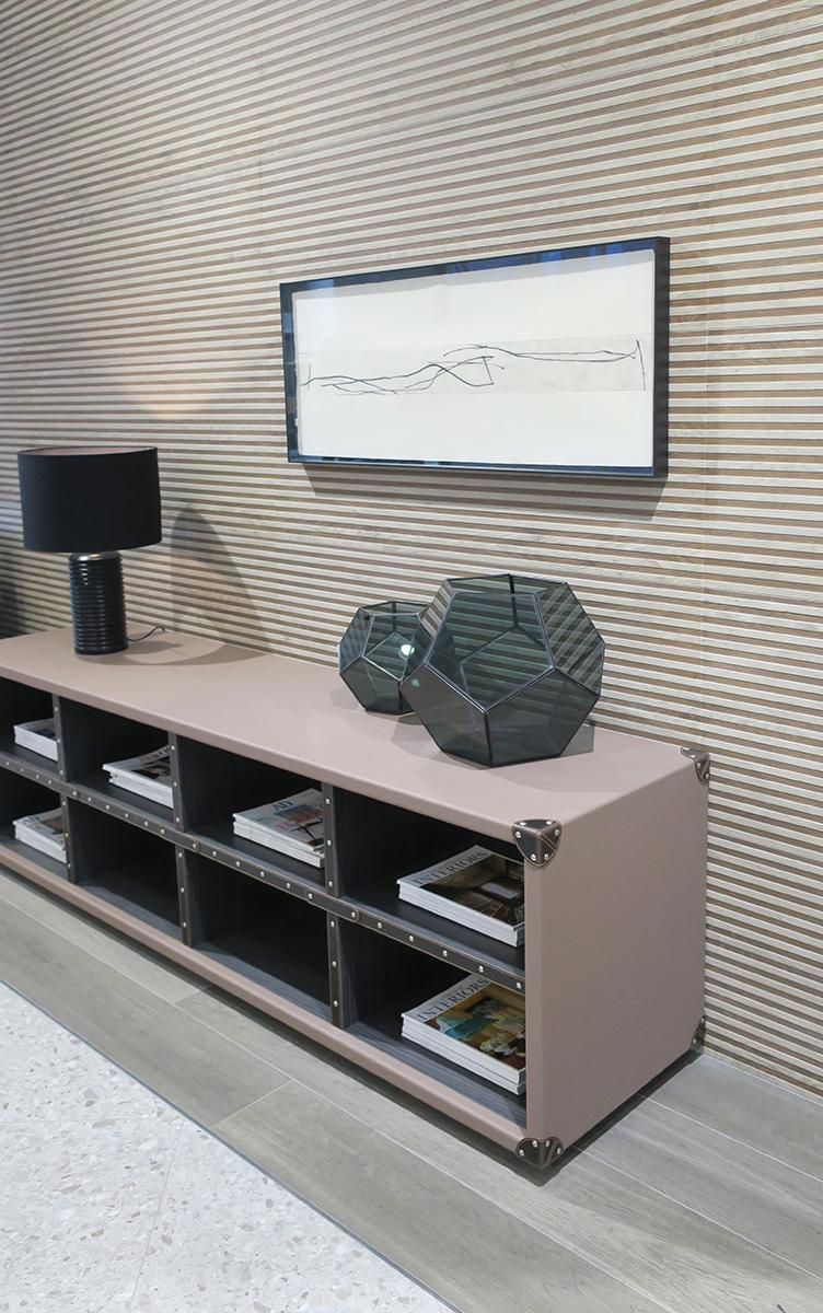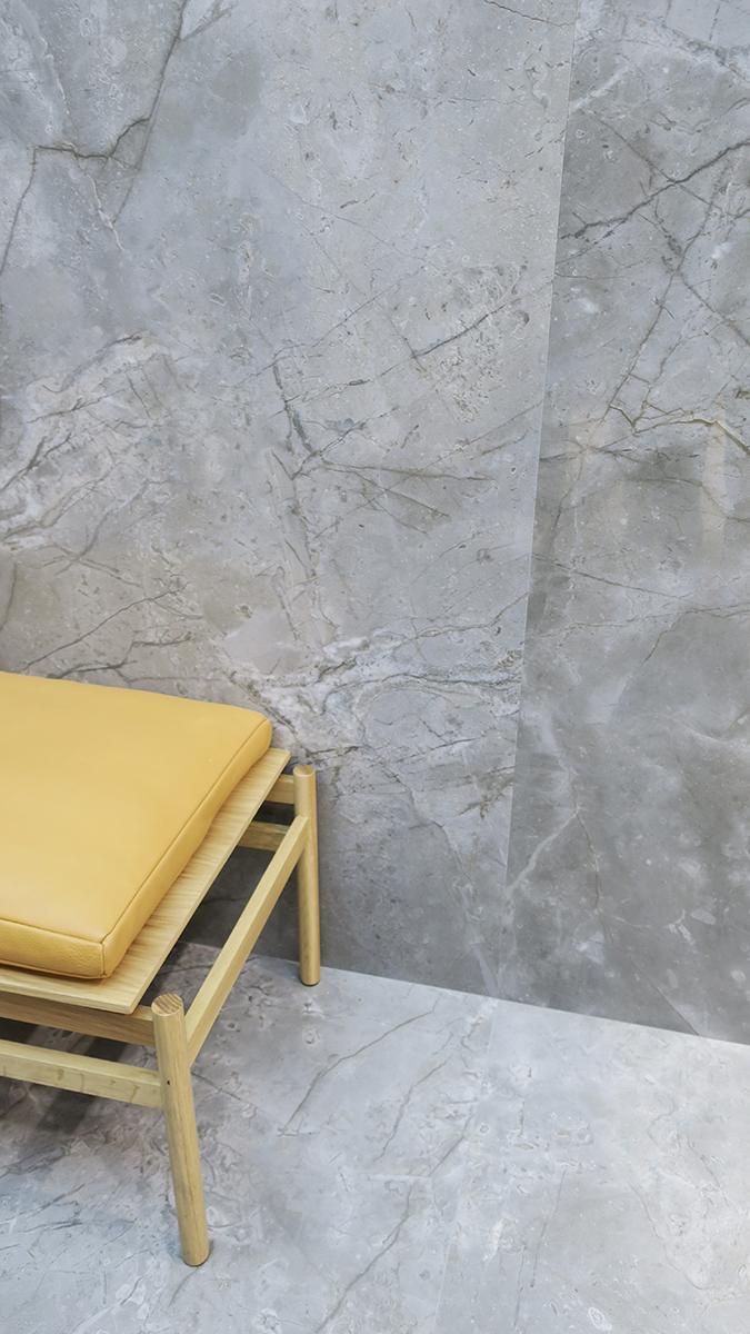 Esta propuesta para portales me encantó: el mismo material puede ser pulido más o menos dependiendo del uso que se le vaya a dar. La pared tiene un pulido espejo que da brillo y luminosidad, mientras que el suelo tiene un pulido menos fino, para que se note menos la suciedad.