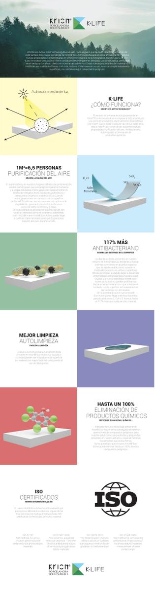 Se trata de una versión evolucionada del Krion (si no sabes qué es el Krion, haz click aquí) que utiliza la fotocatálisis para combatir las bacterias y purificar el aire. Además, resiste a las manchas. En definitiva, un pedazo de invento sobre todo para cocinas y baños, que es dónde más nos preocupan las bacterias y las manchas.
