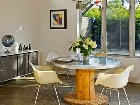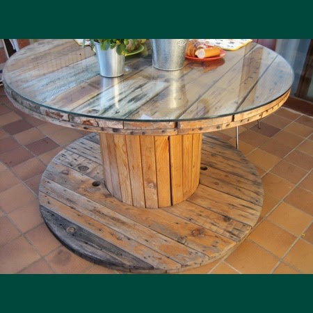 Es tendencia, a pesar de no ser santo de mi devoción, está muy de moda reciclar este tipo de bobinas de cable. De todas las imágenes que he recopilado, me quedo con estas únicamente, pues si puedo ver algo de encanto en ellas, bien por en el caso de la primera imagen, estar teñidas de blanco y encajar como librero en decoración...