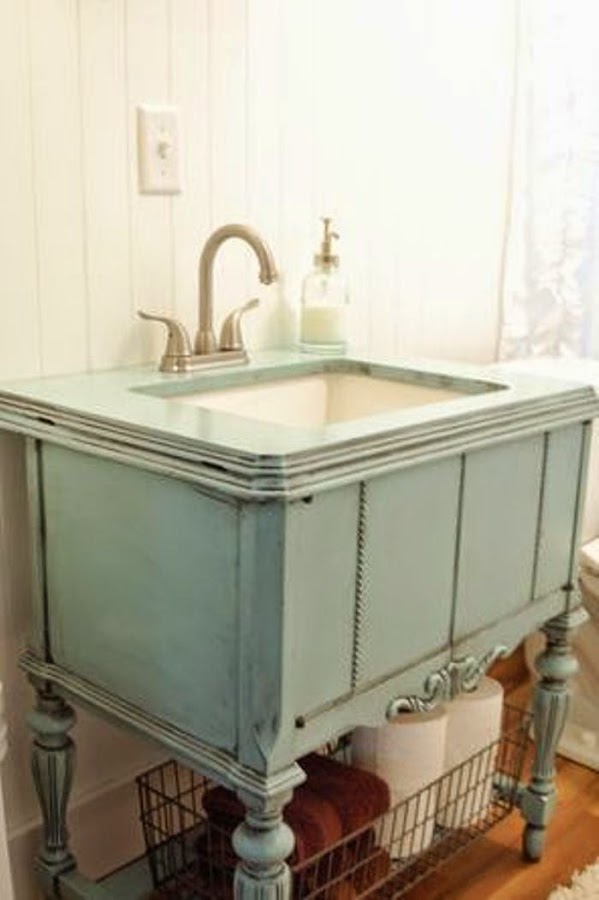 Es una de las opciones más interesantes para aprovechar una cómoda que ya no va a cumplir su uso, bien por renovación de la estancia, bien por que en su lugar ponemos otra pieza y esta nos queda descolgada. Esta es para mi una de las más interesantes de las opciones "un MUEBLE DE BAÑO", en cualquier estilo, tanto en auxiliares modernos como más antiguos o con cierto aire decadente.