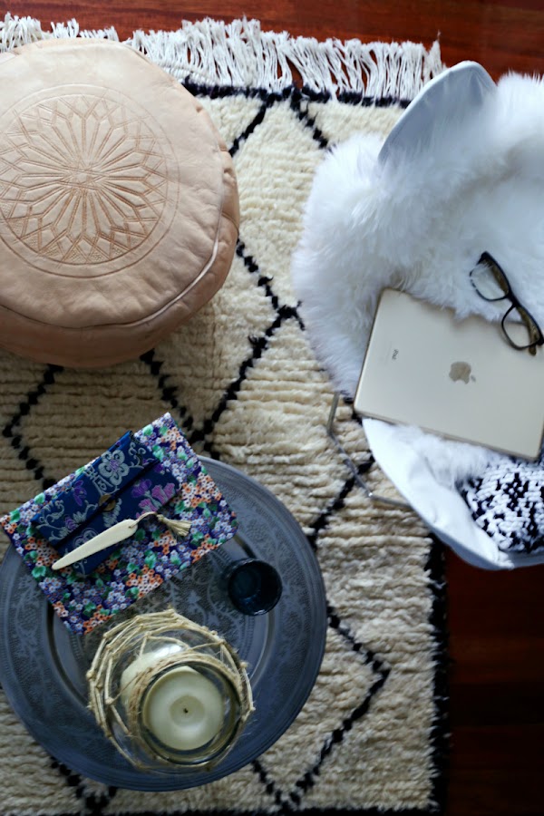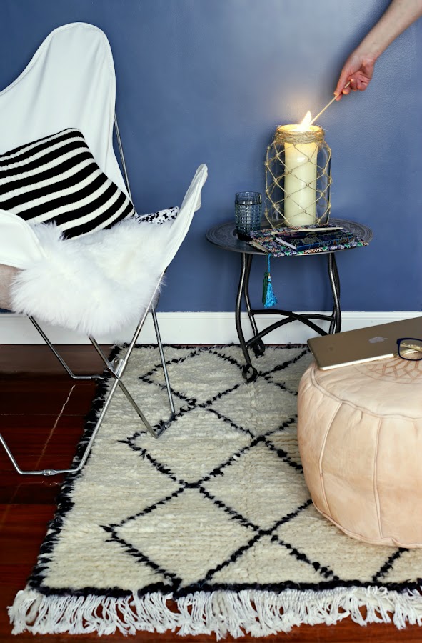 El puf de cuero y la alfombra de lana de cordero con diseño de rombos