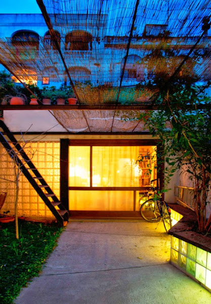 Se trata de un viejo lavadero en ruinas convertido en un estudio-apartamento que tiene como elemento clave del diseño, una estantería combinada con la escalera.